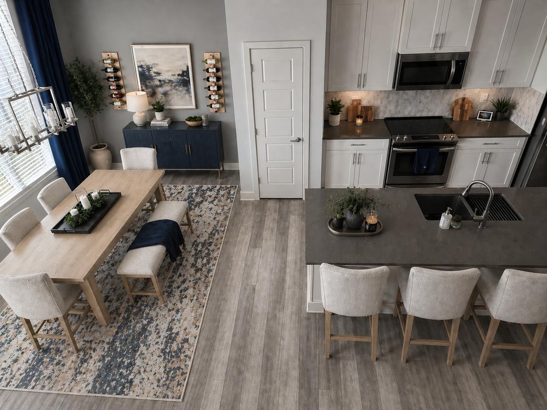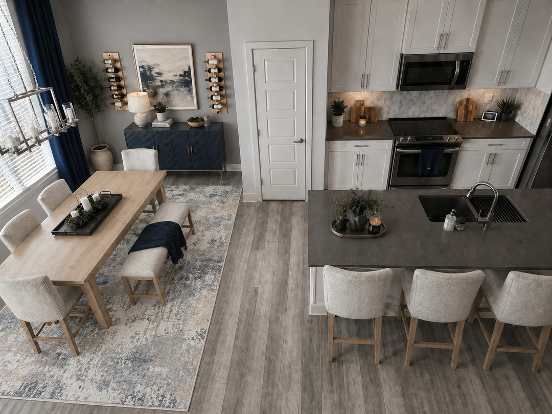 Hello! I am doing some redecorating to my very millennial grey house to make it feel warmer. The folllw 2 images are AI sketches of a wood table with a blue sideboard and new chairs.