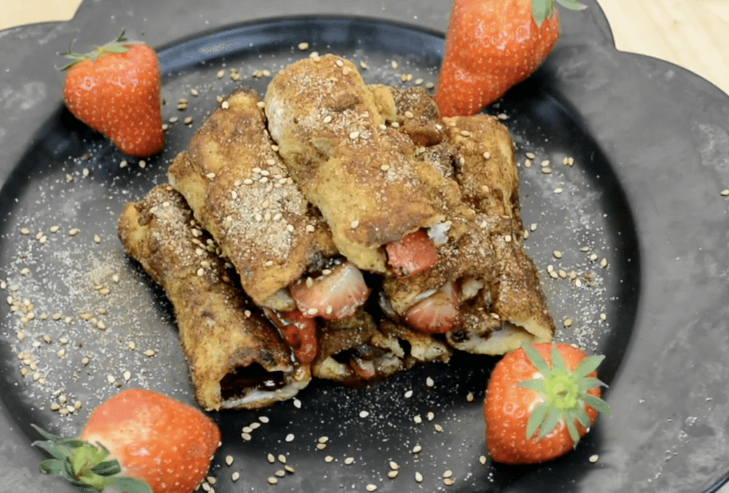 Eggs hit and mix, in a frying pan(socket) melt butter which little strawberry roles turn in egg and roast, golden brown connect in the sugar / cinnamon mixture(miscellany) turn and with sesame sowing strew……