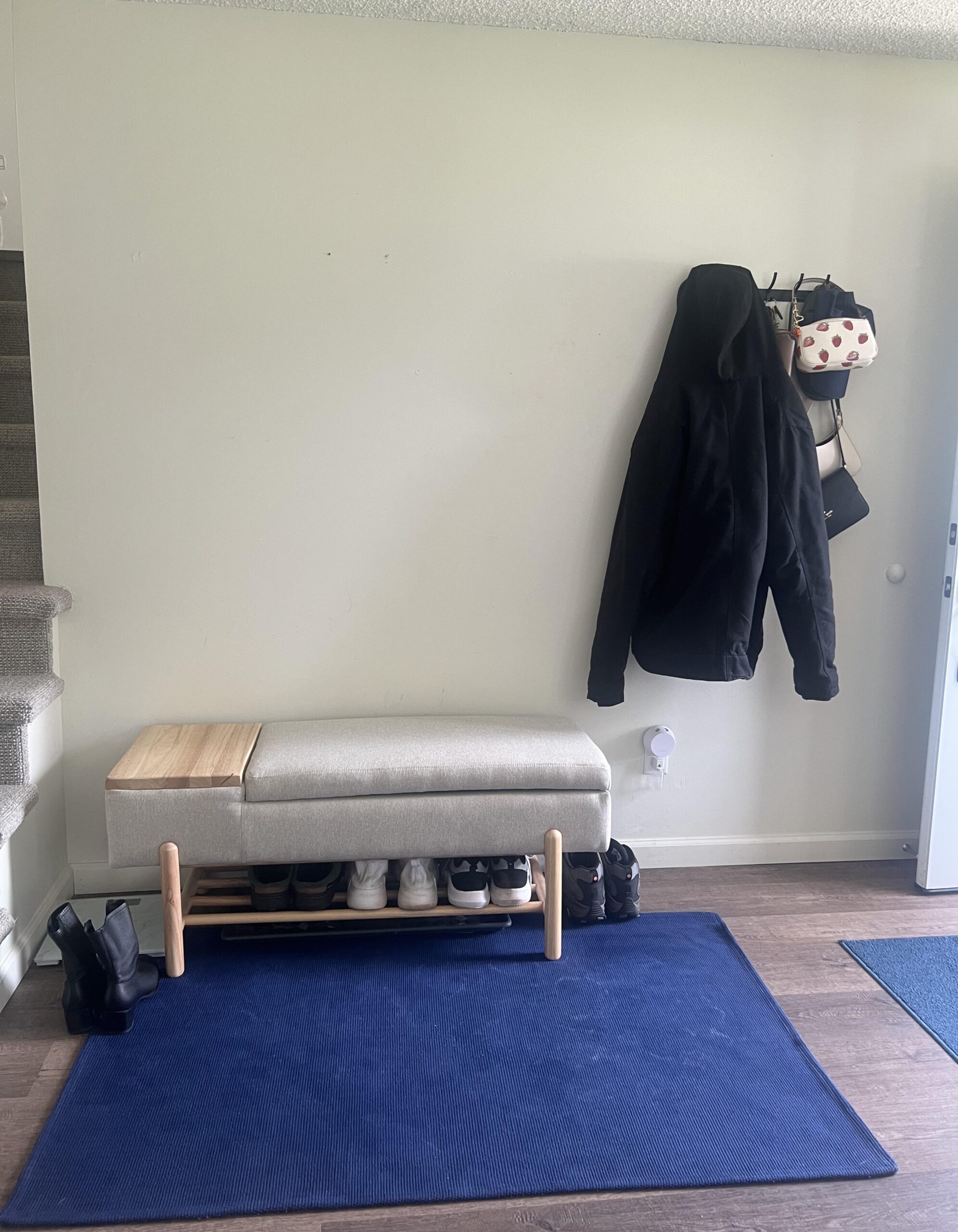 I need help with what to do with this wall. I had a small round mirror up but it looked weird with the space between the bench and the mirror. The front door is to the right and the picture is taken from the living room. Stairs to the left.