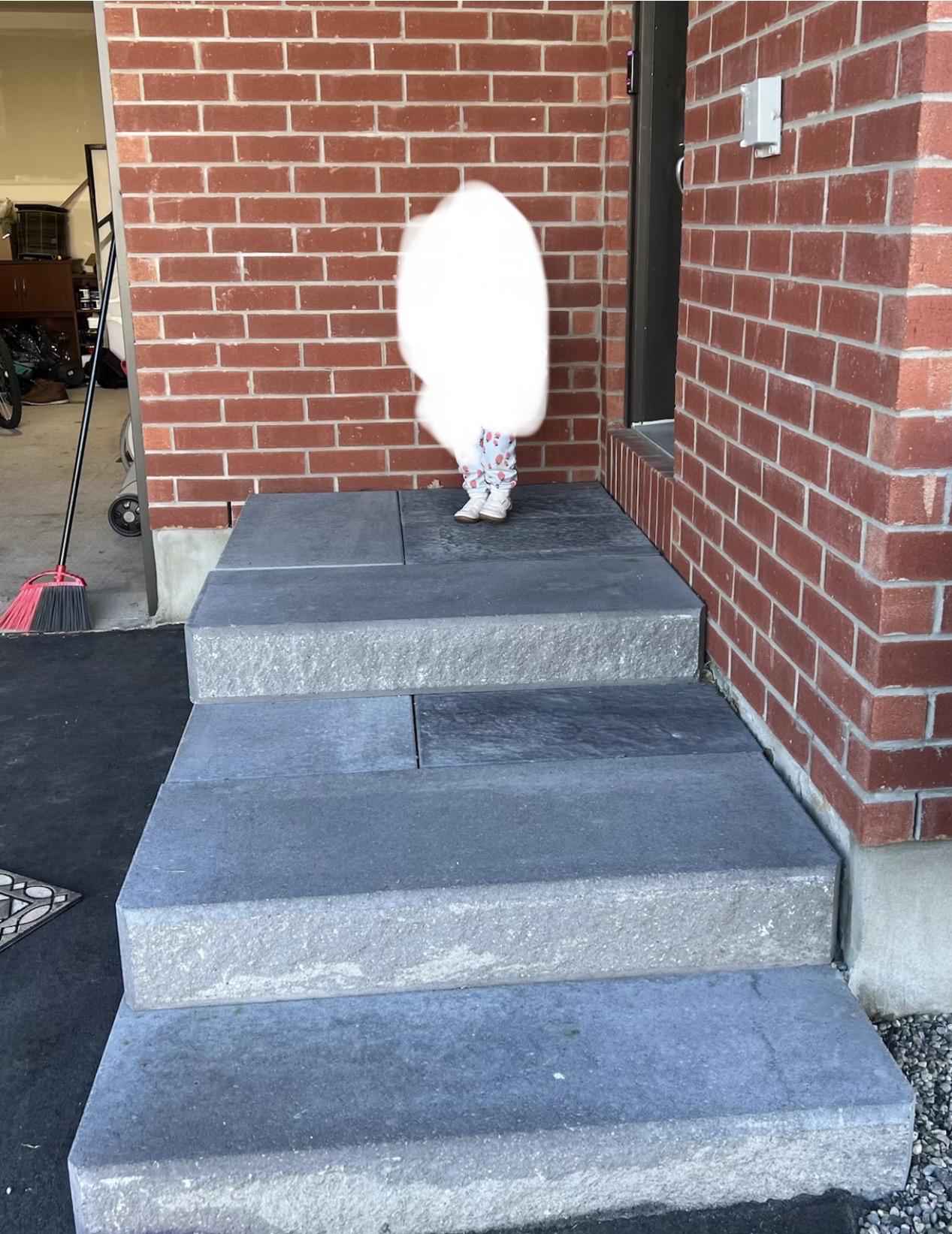 Another solution would be tall potted plants between the stairs and the garage entrance, thin enough not to block car trafic, but that would either stop a kid from running straight off or… catch their fall. Think bamboo, forsythia, willow…
