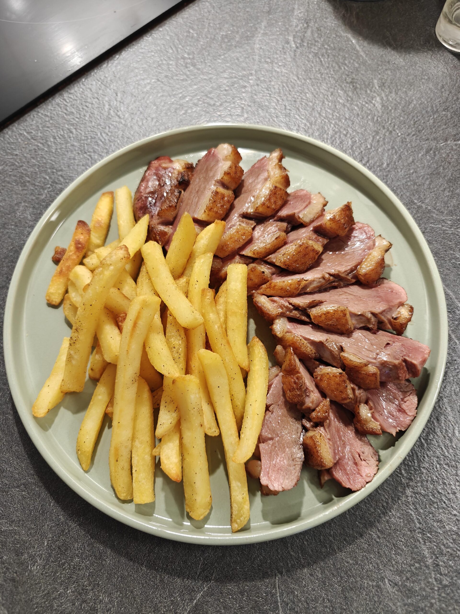 A_french_chinese_man 2 hours ago 👨🍳 **Magret de canard** 👨🍳Avec frites (surgelées) au four avec le gras du canard. Très facile à faire, 6min de chaque côté à la poêle puis 5min au four.**🔹 Recette sur mon site Internet** : [Magret de canard](https://afcmlacuisine.fr/plats/magret-de-canard/)**** **🔹 Difficulté** : 4/10 **** **🔹 Conseils** : ****