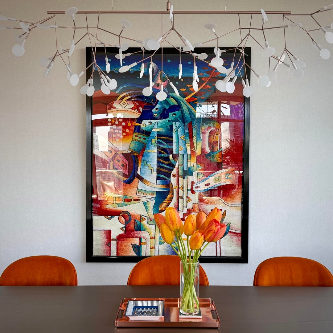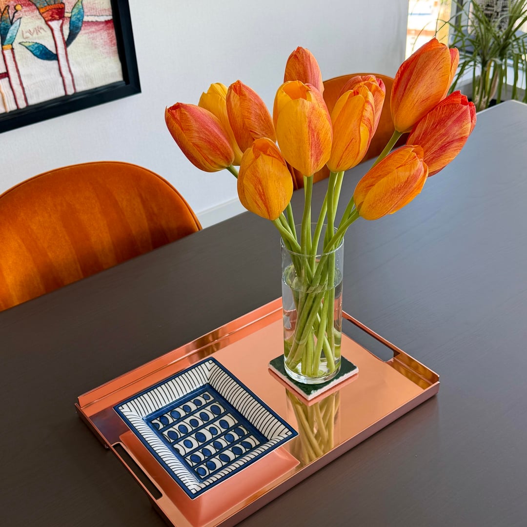 I’m obsessed with tulip season at the farmer’s market. Tulips are matchy matchy with the chairs but I still love them!