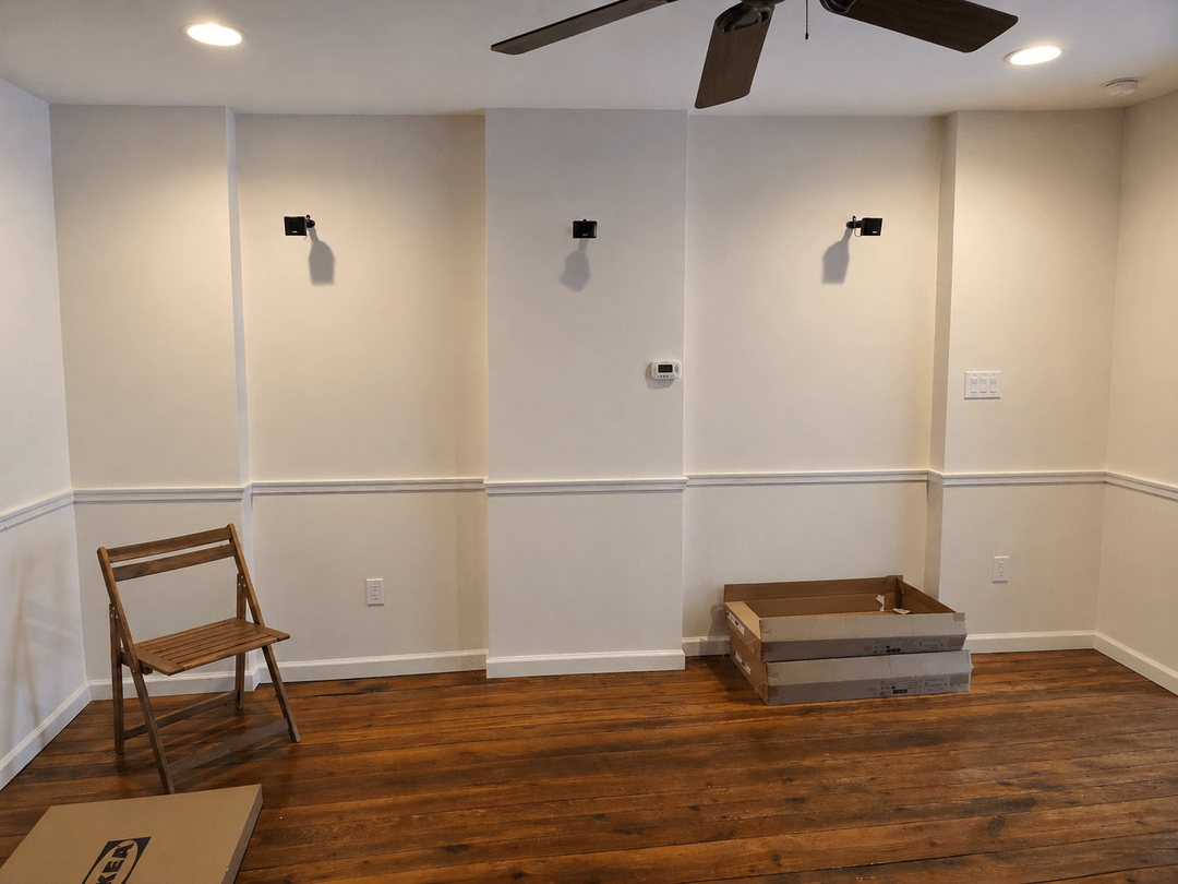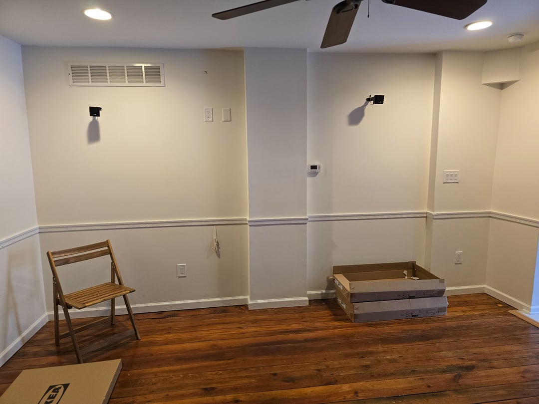 Hi! We recently purchased a home, and the wall in the living space is a bit awkward. The asymmetrical bump outs in the wall drive me a little crazy on their own, but we also wanted to do wallpaper or stenciling/hang art and it makes me concerned that were we to add a pattern or more visual interest to the wall, the lack of symmetry would only pop out more. I'm considering doing drywall to either make a flat wall myself, or making the space symmetrical with small faux walls (as in the second AI generated image).