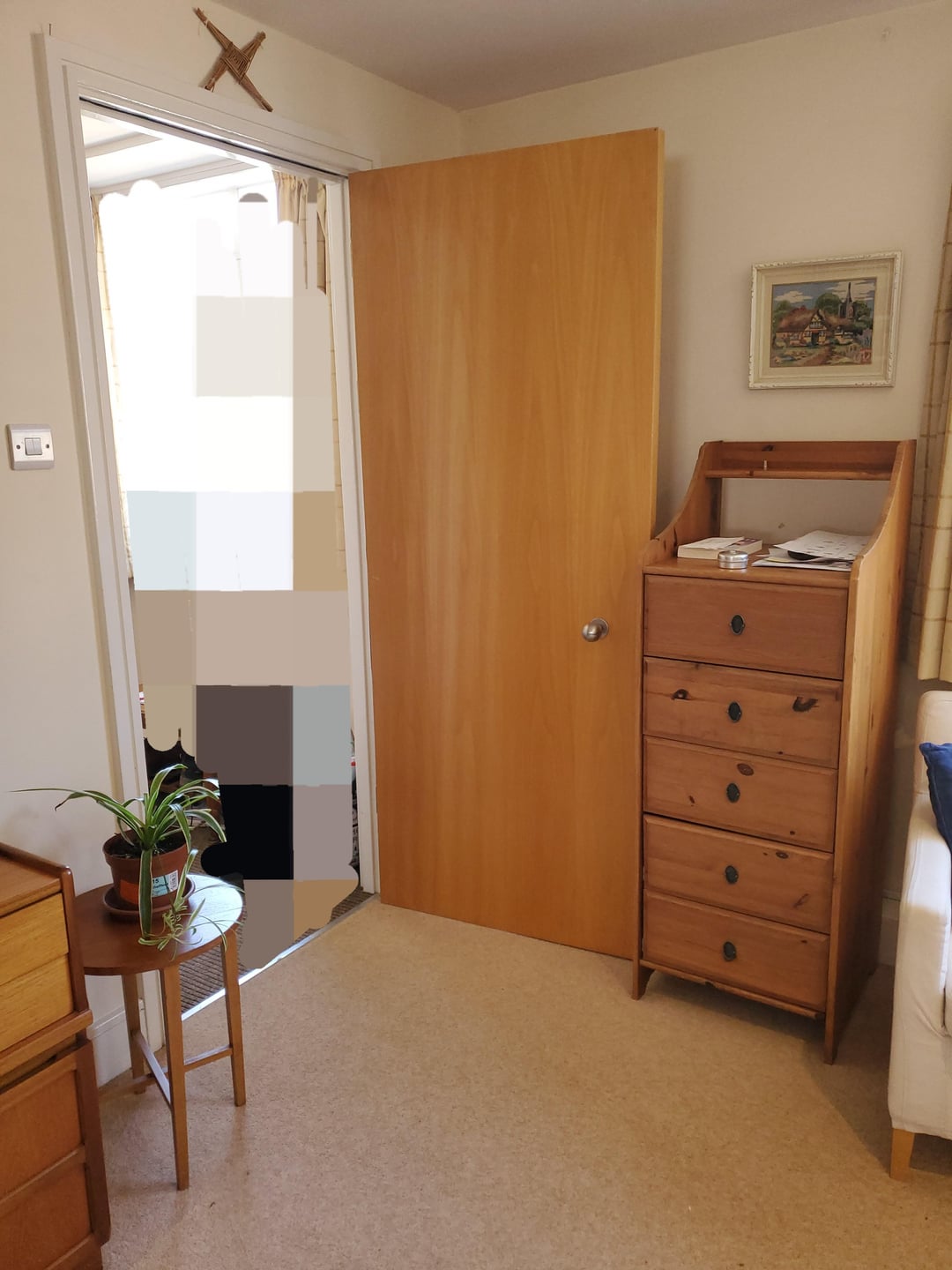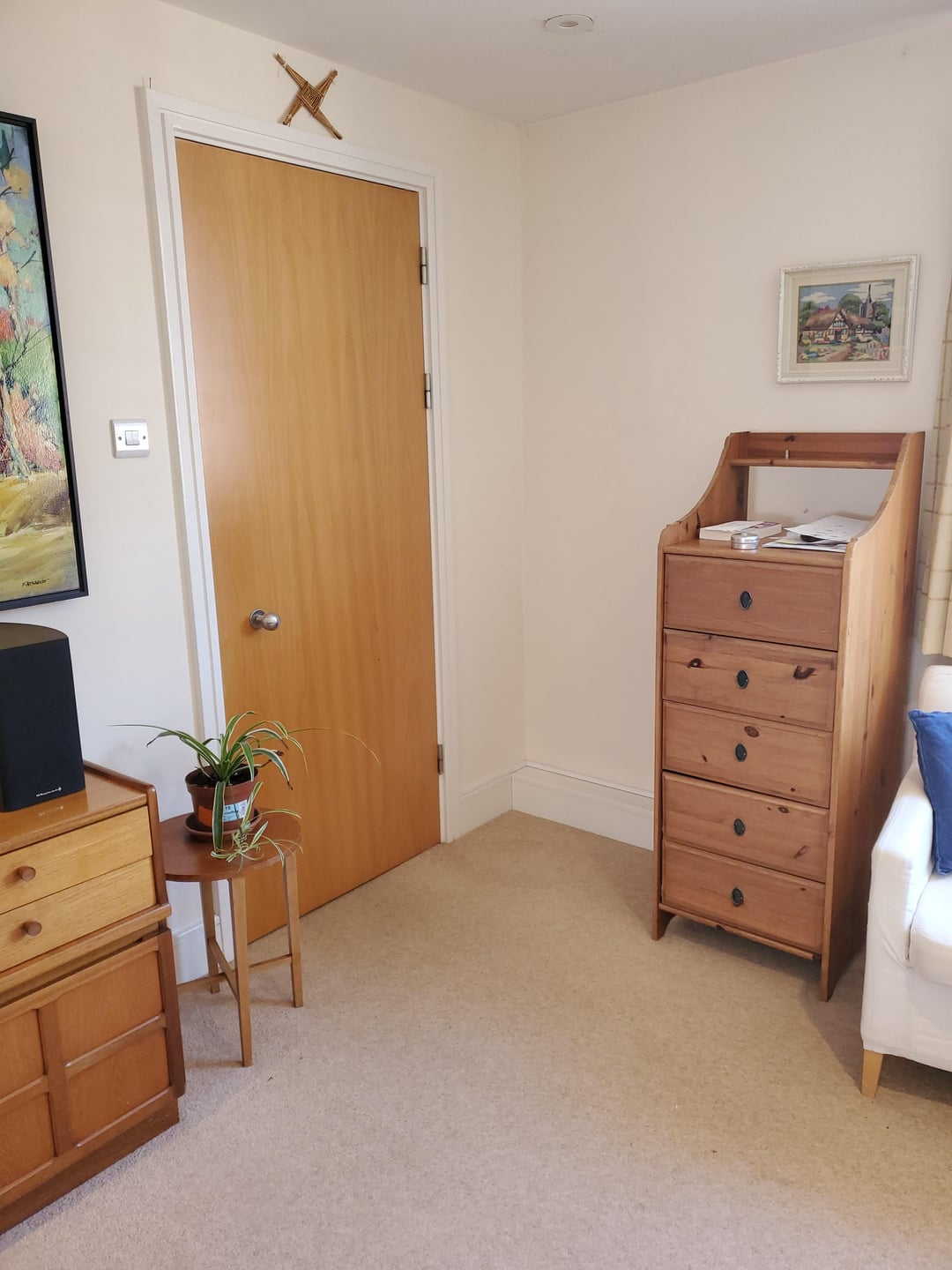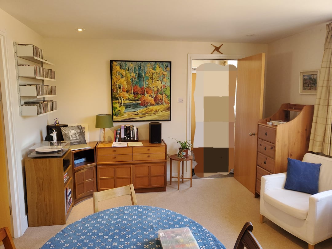 One challenge is that the wall with the window has very thick baseboards, so nothing can actually go completely against the wall. Another is that there is a weird empty space behind the door that opens into the room. It is kept open 90% of the time, so the empty space is covered, but we do close the door when we are playing music or are generally being loud to muffle the sound for our neighbors.