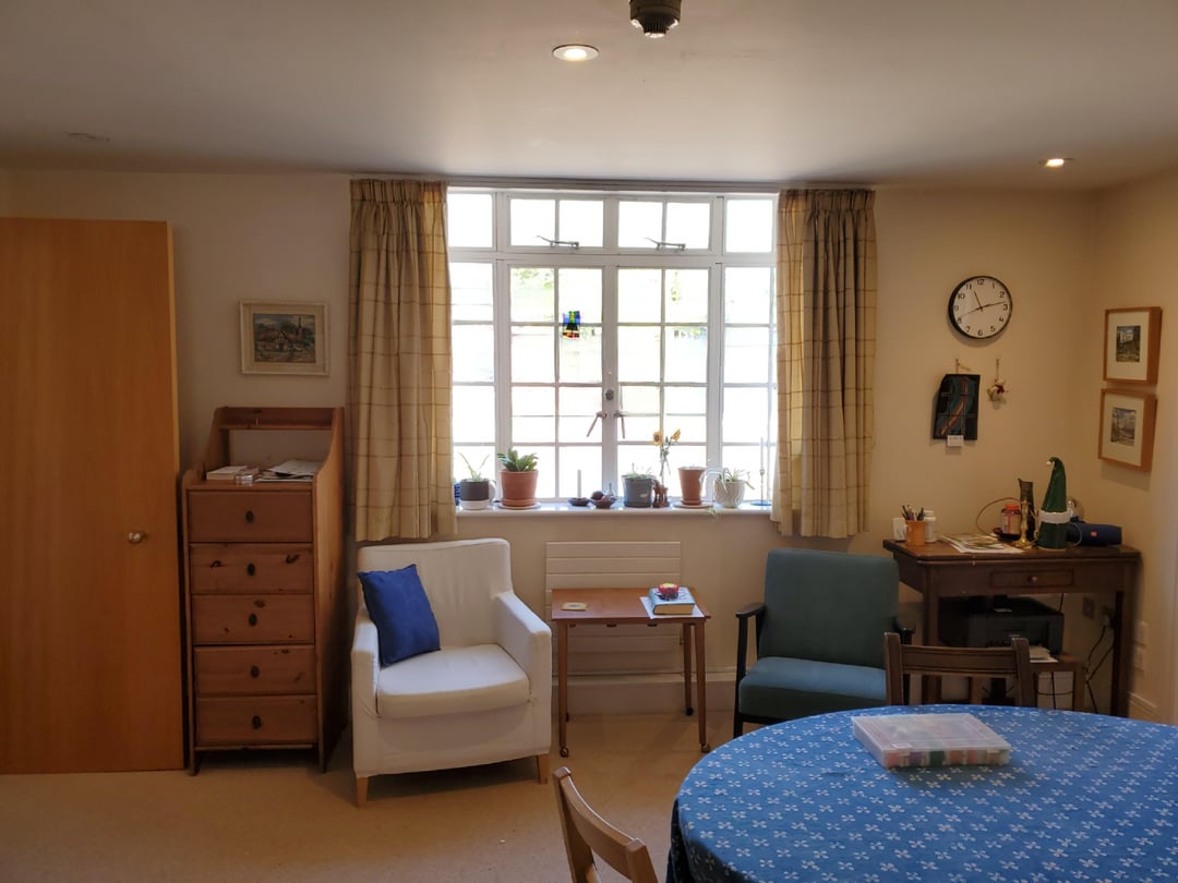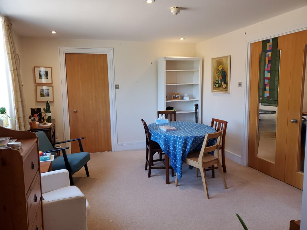 This is where we eat most meals/hangout/have people over. We have another room (through the double doors) with a sofa, tv, bookshelves, and desk.