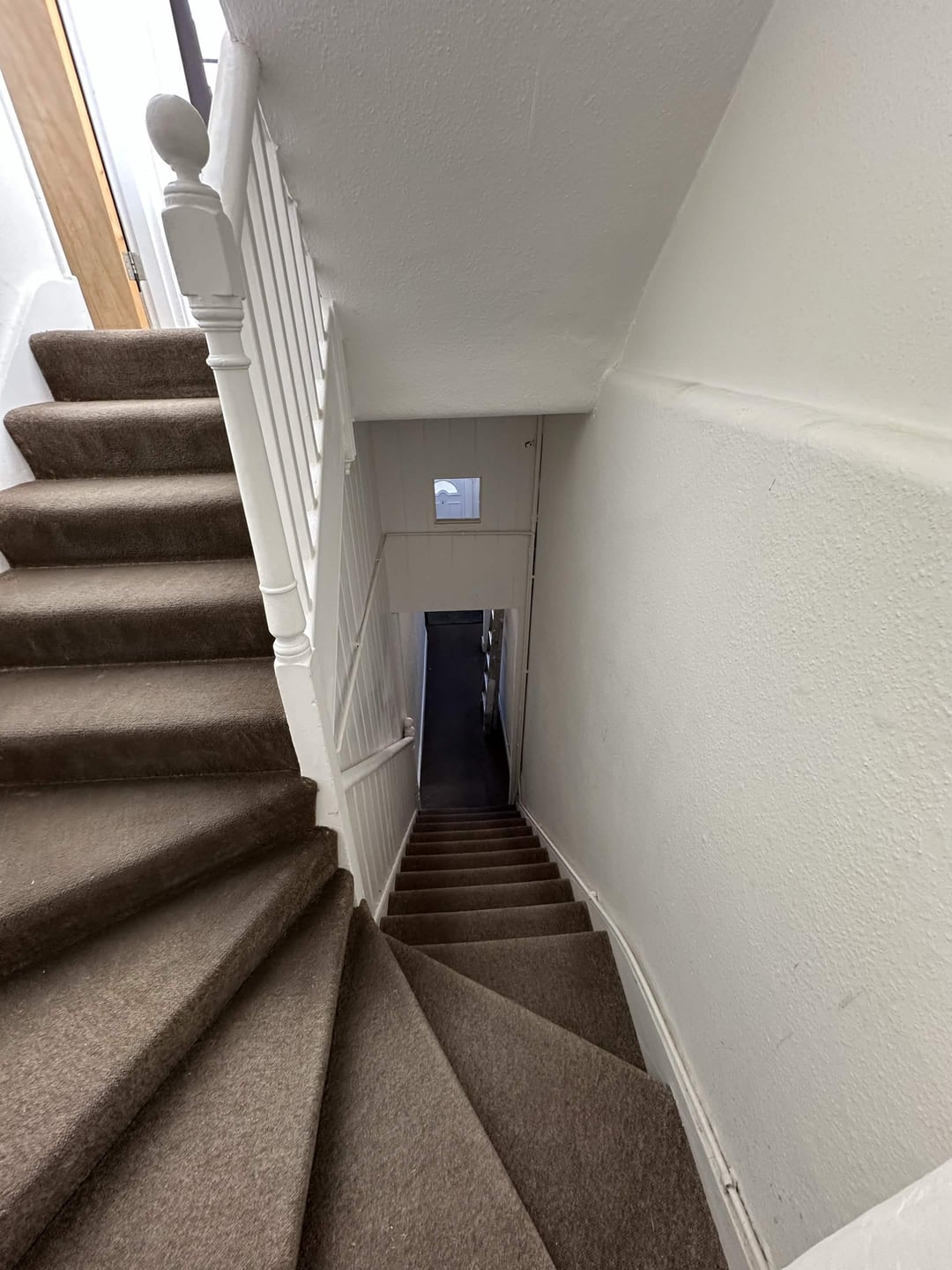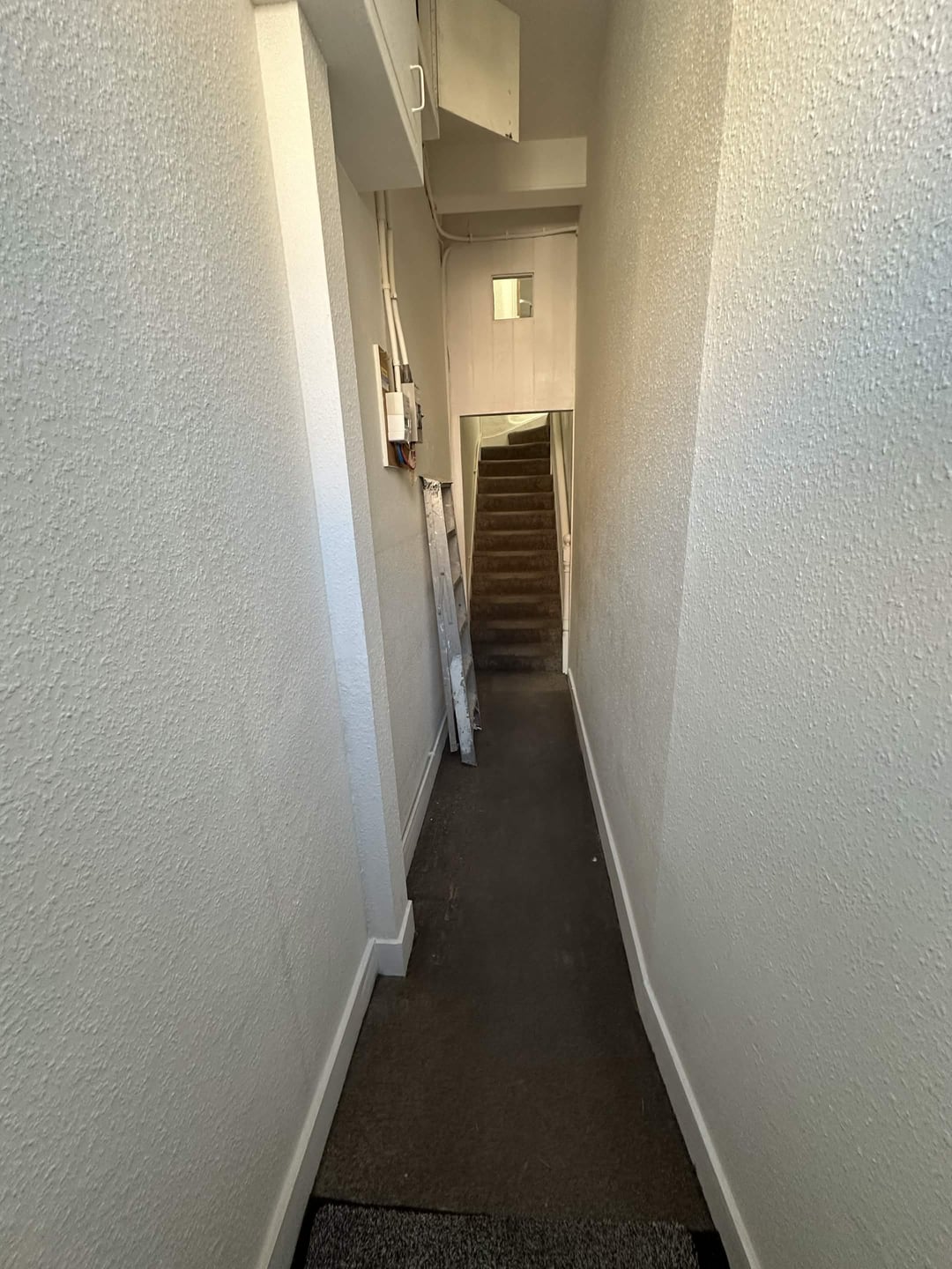 Renovating a flat that has a long entryway, approx 5 metres by a metre wide. Not a fan of the brown carpet but I'd like to keep them on the stairs for the time being.