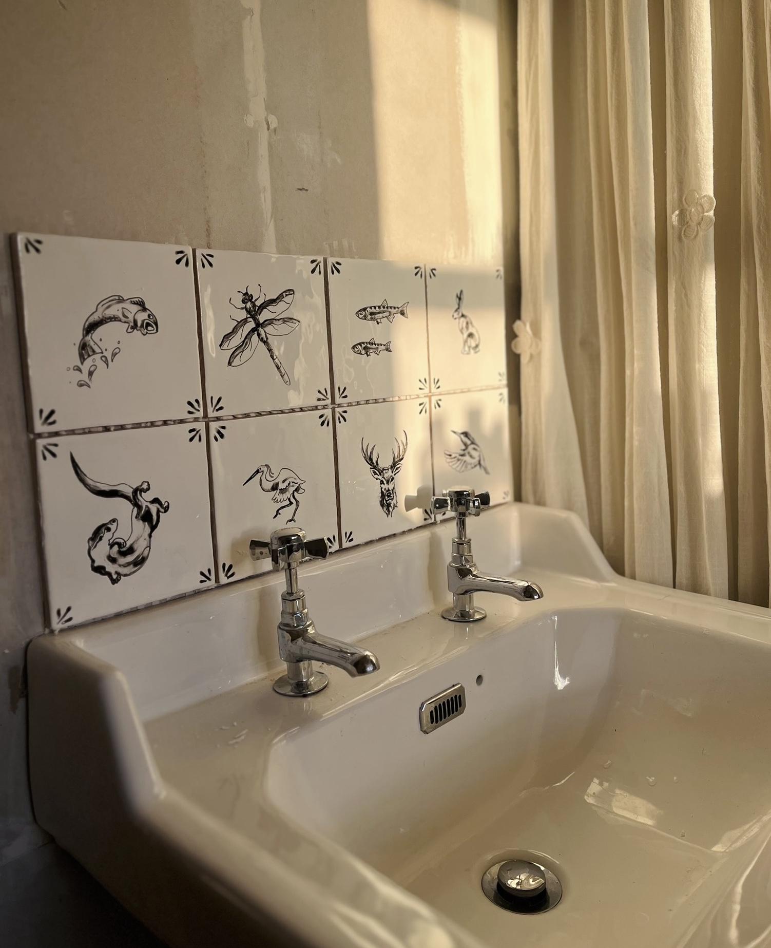 My hand painted tiles are up (but need grouting which I’ll do this week). Each one a favourite creature that frequents the River Nadder down the lane.