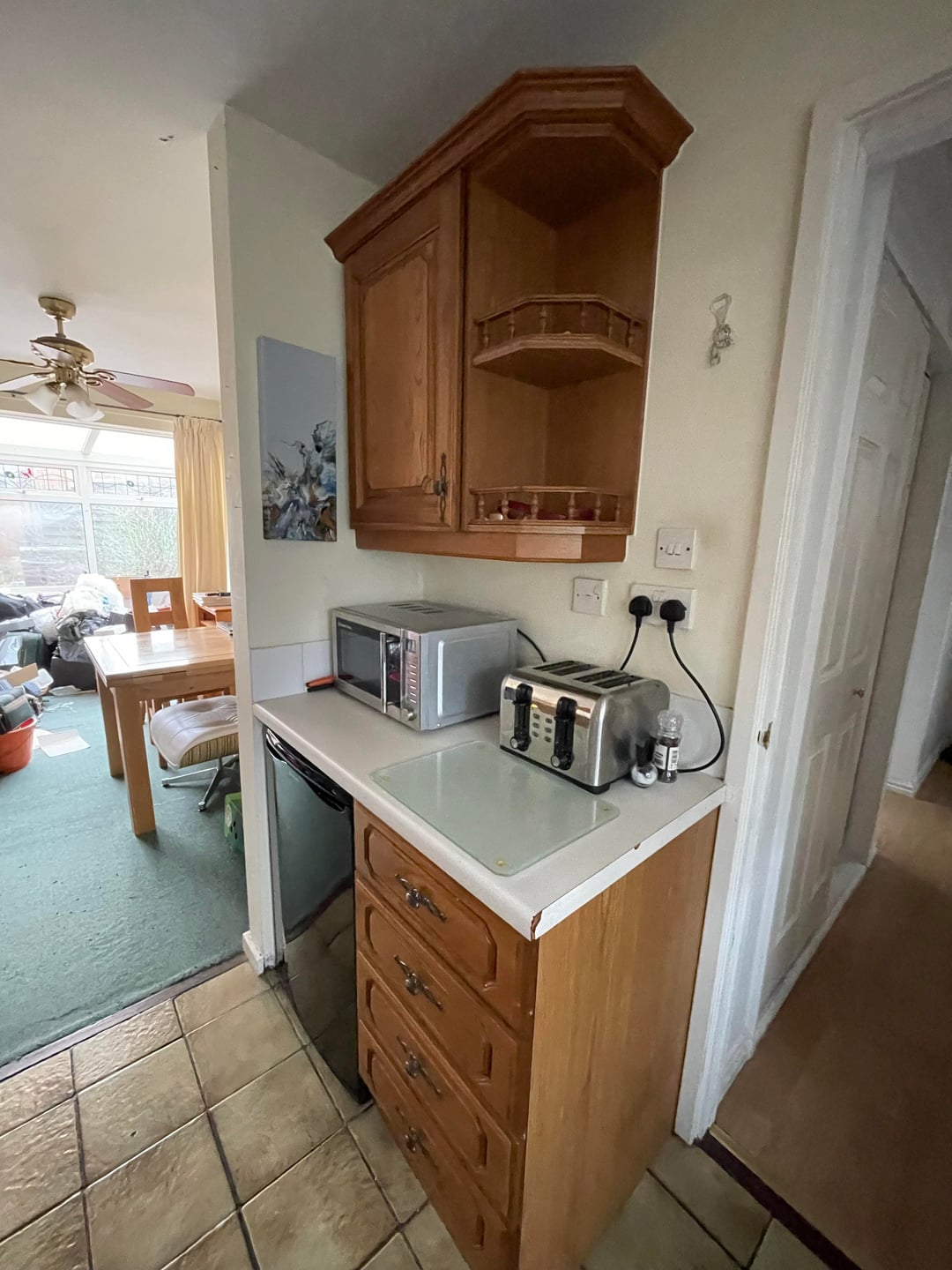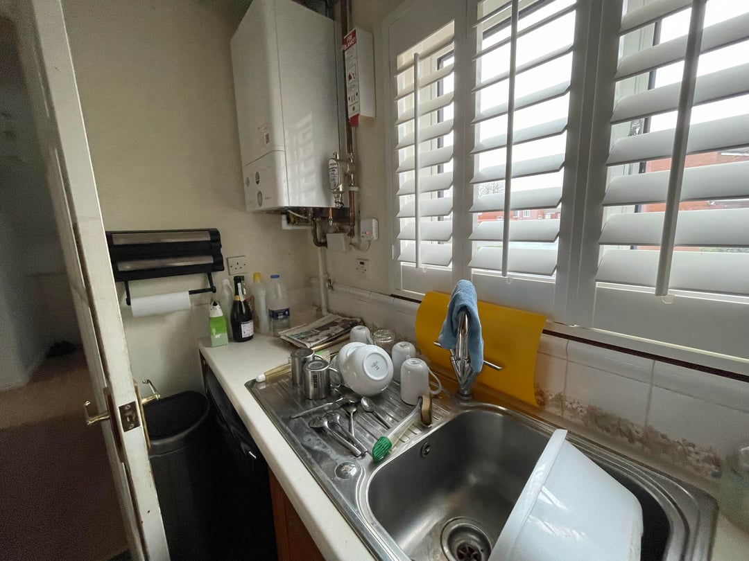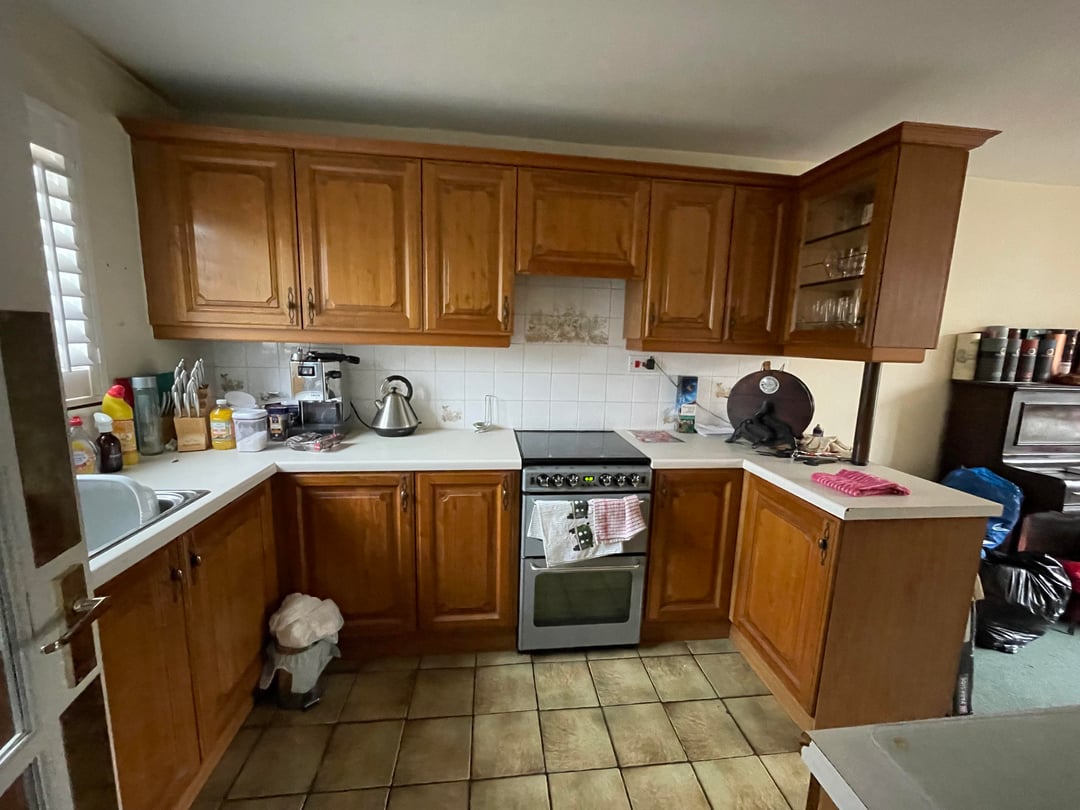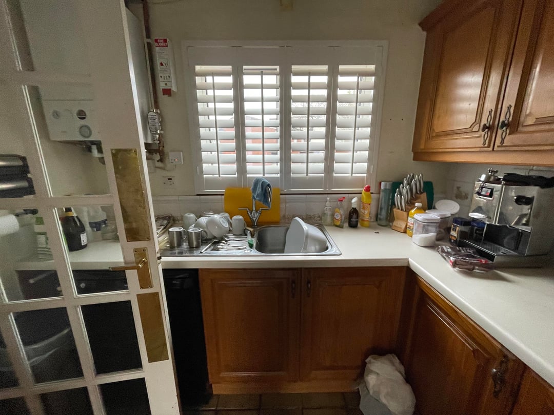 Declutter, get rid of the small garbage can (it looks like there’s a bigger one in pic 3?), put things away in the cabinets.