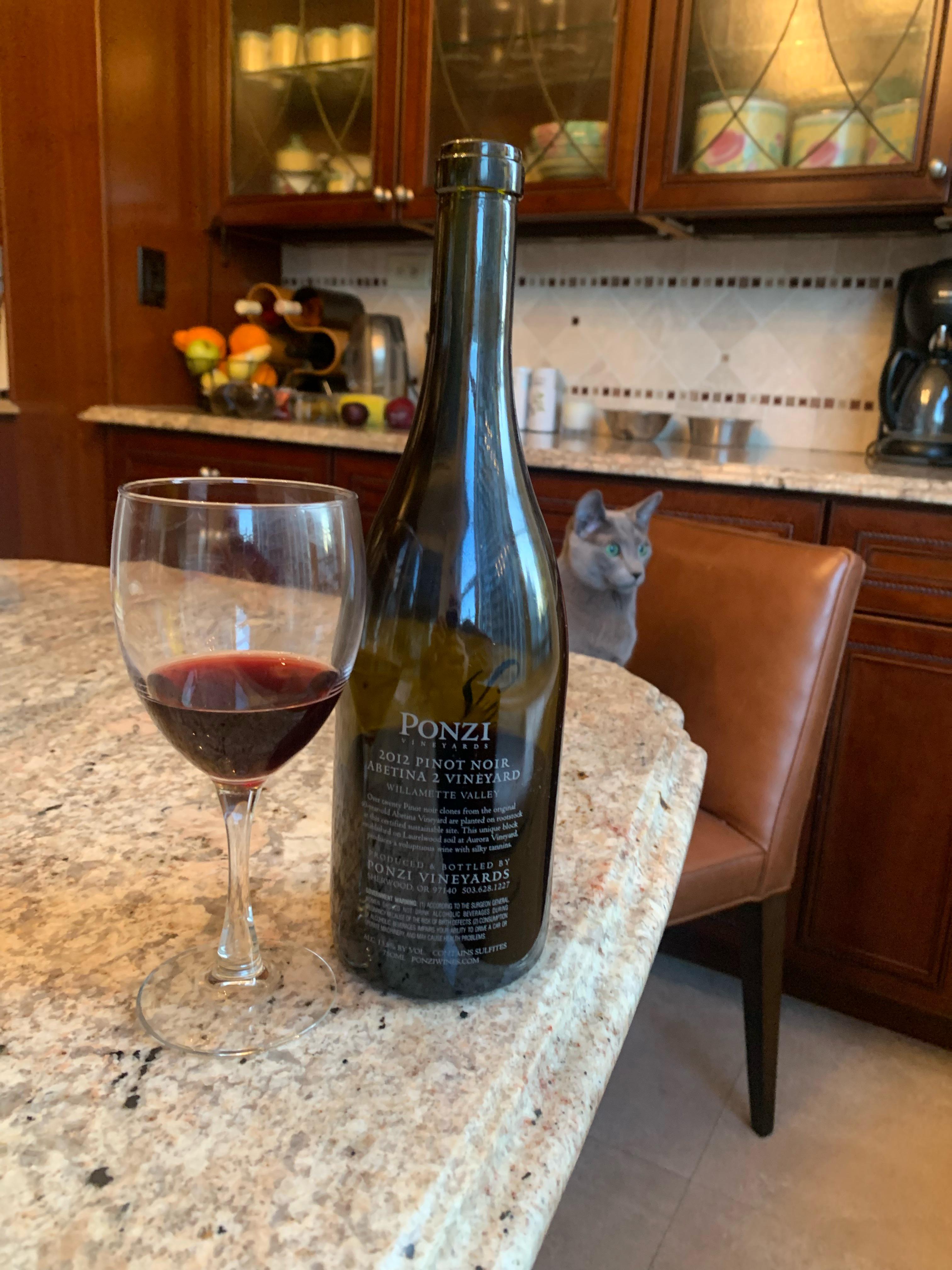 Upgraded the “daily drinker” to Ponzi 2012 Pinot Noir Abetina 2 Vineyard. It’s my dog’s third birthday but her younger feline sibling “photobombed” this review.