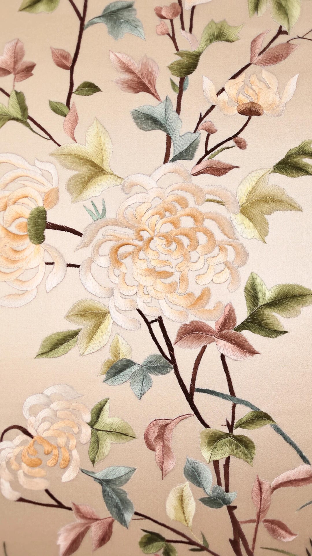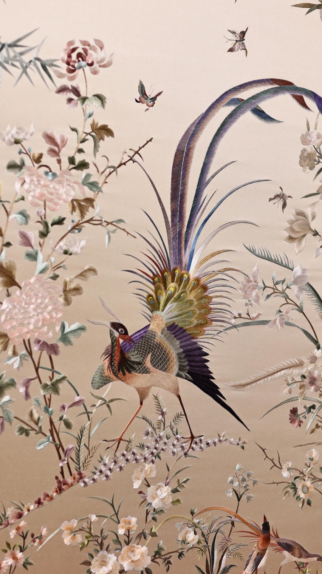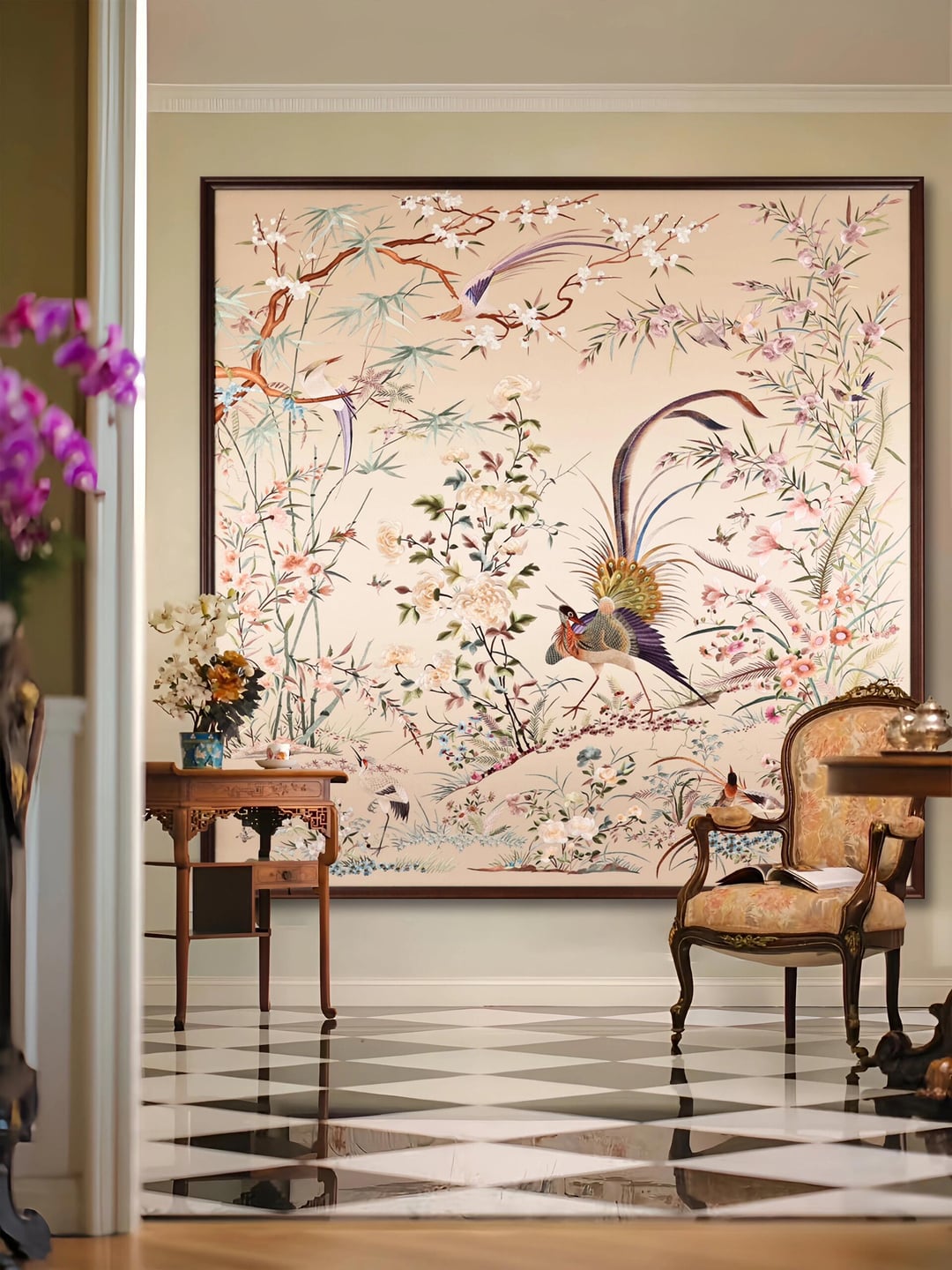 We introduced a large-scale hand-embroidered wall piece as the focal point. The level of detail adds texture and depth without overwhelming the room.
