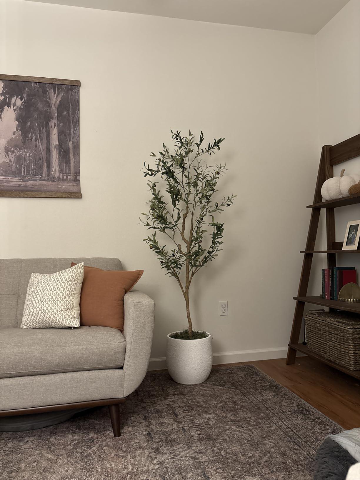 i did something similar in my setup and ended up moving the lamp because it made everything feel too busy. you could try a tall narrow bookshelf or maybe some wall art above where the plant is now. the room has nice clean vibes already so don’t overthink it too much. sometimes less is more especially with that neutral color scheme you got going