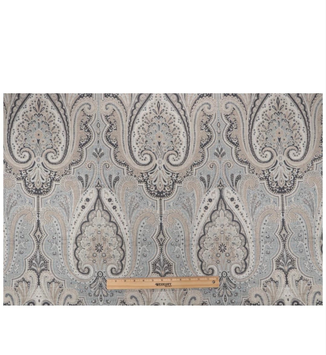 I found this drapery fabric and thought it may look good as drapes against the blue wall. The pattern seems very close to the rug, but I’m concerned about it looking too “busy” or tacky. I could also make throw pillows for the bed and/or couch with the extra fabric. Would this look good, or would it be too busy looking with too many patterns in the room? Should I go with simple solid color drapes, like a linen or beige color instead? Any ideas or recommendations?