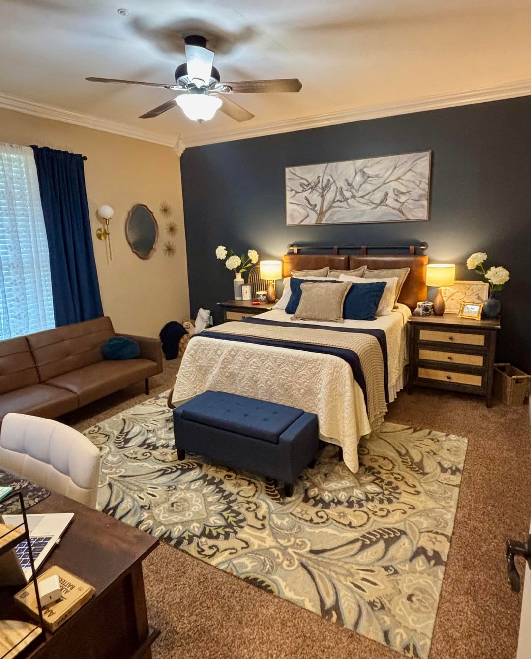 I agree. I hate such a dark accent wall in such a light room. I do think the entire room would look better in the blue. I’d do white linen curtains to lighten things up and give contrast, as well as keeping the trim white. I’d use your lovely fabric for pillows or shams, and I’d look for a new rug that coordinates better with the rest of the room. Like [this](https://www.wayfair.com/rugs/pdp/ebern-designs-skiles-machine-woven-rug-w114250314.html?piid=6375727). Or [this](https://www.birchlane.com/Lauren-Ralph-Lauren–Lauren-Ralph-Lauren-Nina-Hand-Tufted-Wool-Pile-Oriental-Rug-LRL6606N-L167-K~LBRL1508.html?ireid=374289485&PiID%5B%5D=47491767&refid=GX676336541488-LBRL1508_47491767&device=c&ptid=293946777986&network=g&targetid=pla-293946777986&gad_source=1&gad_campaignid=20628989714&gbraid=0AAAAADNG5UhwAjY_HQbZb_vdURbKtREyn&gclid=CjwKCAjwtcHPBhADEiwAWo3sJpRTzqWdc3nnOhXh-R4VBOjGrtPEsbgJ5SEy7OVXD29abFAk6Ih_MRoCnAcQAvD_BwE).