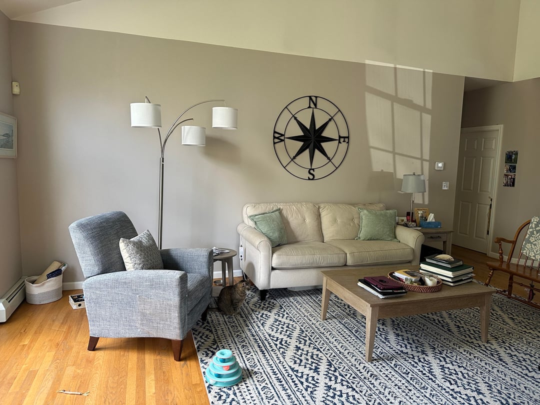 The wall color, furniture and rug are relatively new and staying. I will be adding a second blue chair in the future.