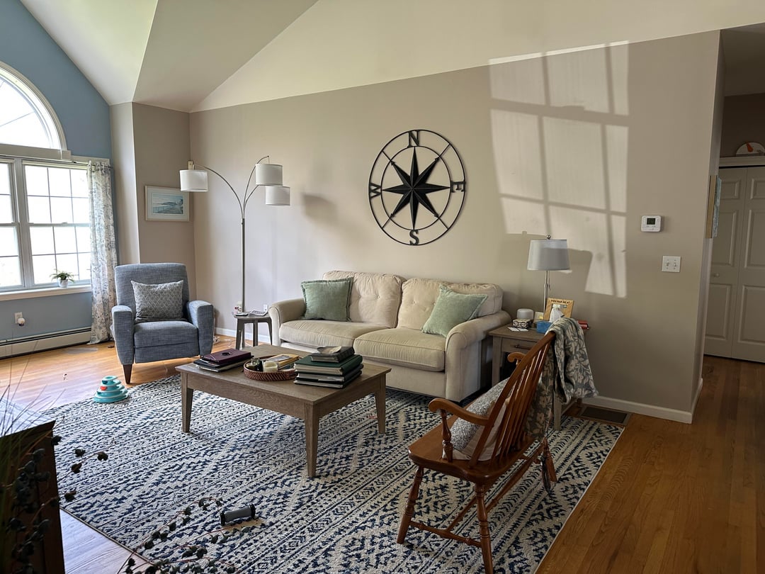 I’m looking for advice for this large wall in my family room. The painted portion is 9 feet high and then there are vaulted ceilings. I just bought this compass, and I like it, but I’m unsure of how to decorate around it.