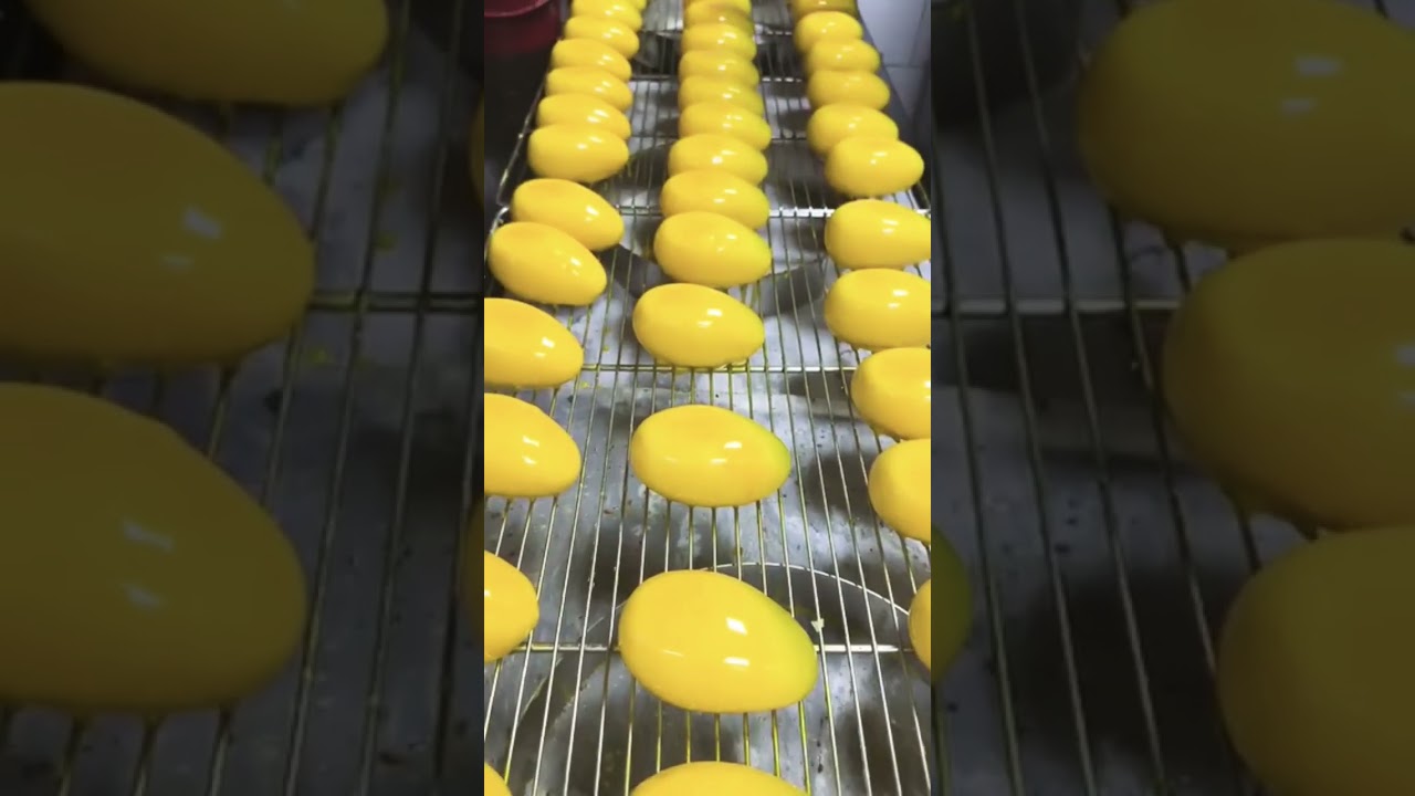 These items are realistic fruit-shaped entremets, likely orange or mango flavored pastries. They feature a shiny mirror glaze finish applied while resting on a wire rack. Type: Gourmet French-style pastry/dessert.