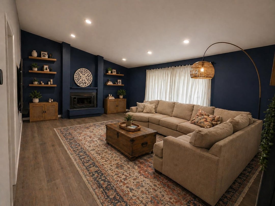 I need help figuring out how to decorate my living room. We ripped out our carpet and will be adding a dark brown/grayish wood floor. The color of the wall will be a dark blue color so I would want the colors of the rest of the living room to mesh well together. I will be keeping the same sectional so I can’t change that. Do I paint just the fireplace wall the color or also the wall with the curtains? Do I add white curtains or what color would look good with everything else? I like the rug and the hints of red and blue. I really love the blue and terra cotta combination so I’d want to incorporate more of that. Any ideas would be great!