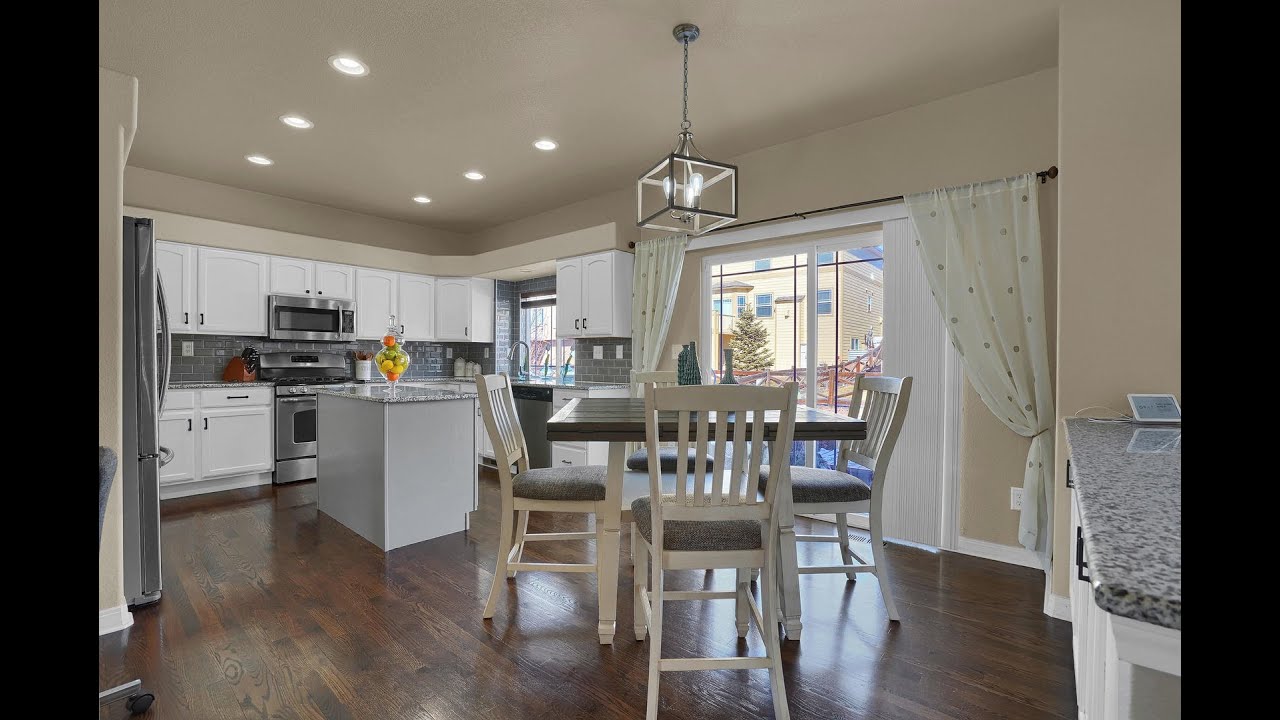 This well cared for home is the popular Classic Homes “Vail” model in desirable Banning Lewis Ranch with a spacious fully landscaped in yard. The formal living/dining room has a dramatic columned archway, recessed ceiling, crown molding, & large windows with abundant natural light. Professionally remodeled kitchen features, lovely white cabinets granite counter, tile backsplash, recessed lighting, stainless steel appliances, modern lighting, fixtures, hardware, wood floors, & dining nook that leads to the backyard. Main level family room opens up to the kitchen nook and features a gas fireplace with mantel. Spacious master suite with vaulted ceilings, adjoining 5 piece master bath with french doors, tile surround, & walk – in closet. Three additional bedrooms with two having walk-in closets & one featuring a stunning view of Pikes Peak. Upper level full bath has double vanities & tile surround. Over-sized lower level has surround sound speakers, recessed lighting, room for a pool table or theater room, wet bar rough in, with additional 5th bedroom & bath. Upgrades include, AC, newer roof, landscaping ,wood floors. Close to parks, trails, schools, & much more.