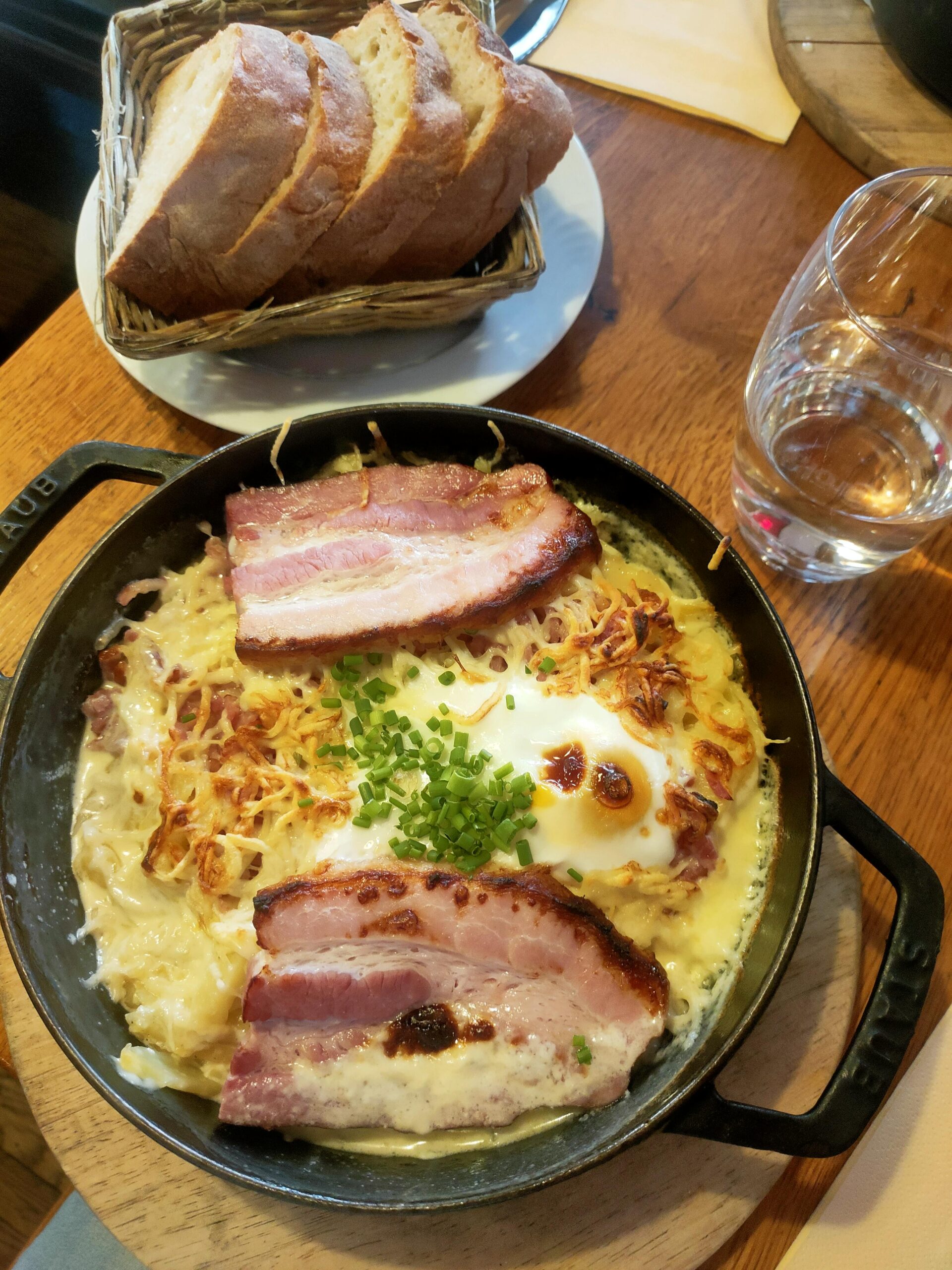 Pendant mon séjour en Alsace j'ai redécouvert le roestie dans un resto à Colmar. Des pommes de terre coupées finement en lamelles cuites avec de la crème, du fromage râpé, des lardons, des tranches d'echines fumées et un œuf poché.