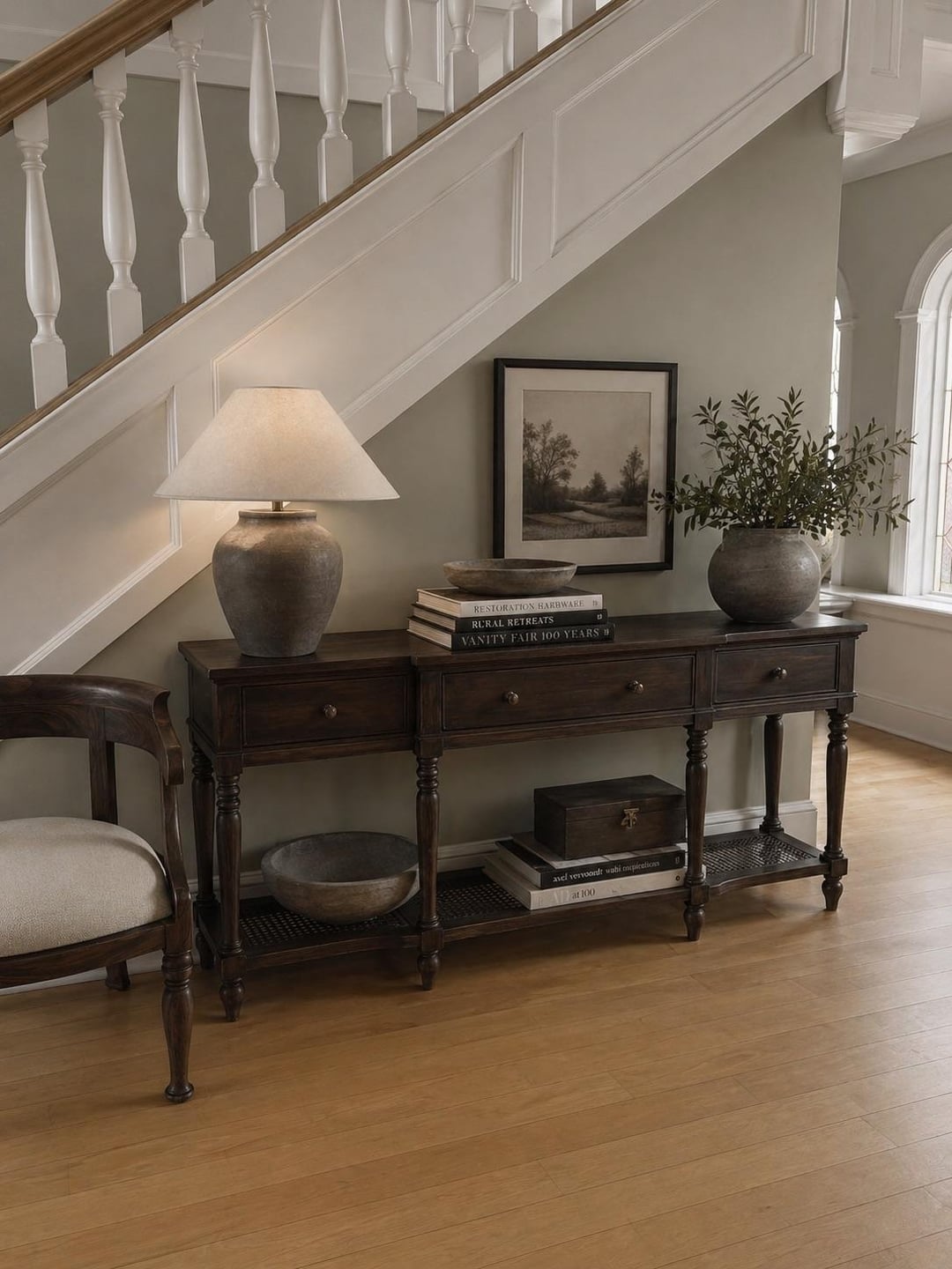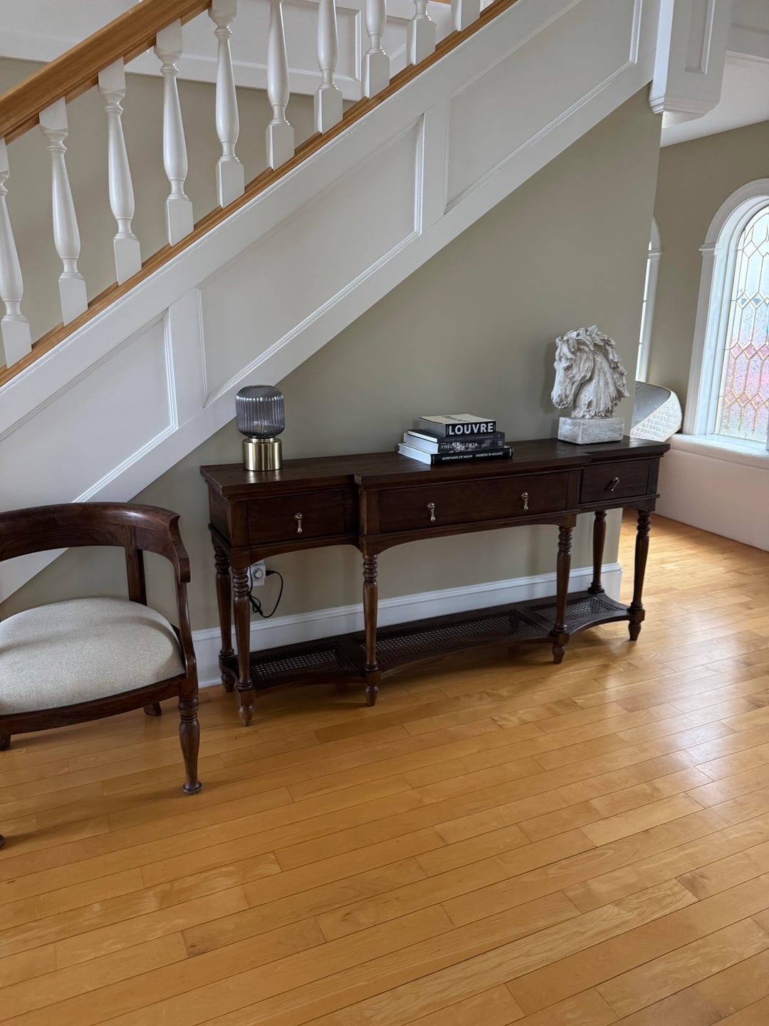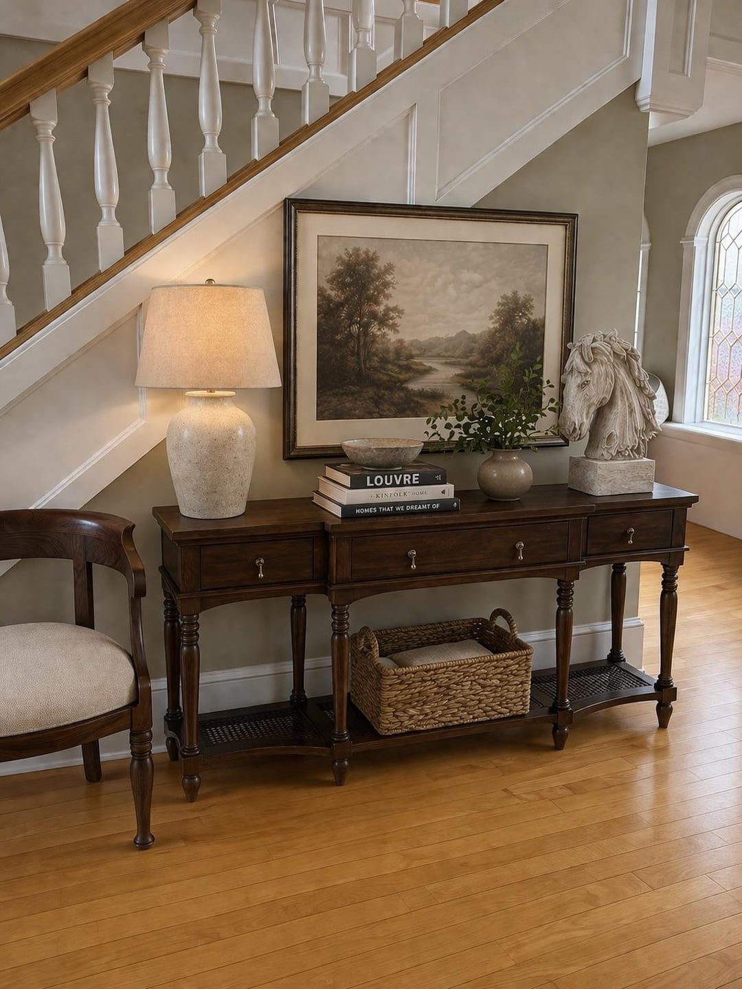 Hi all, looking for some insight on how to style my entryway table. The first picture is how it currently looks. The following pictures are mock ups. What do we think of the mock ups? Also in terms of picture placement, does it look better to be centered over the table( the larger picture) even though it’s partially on the board under the stairs? Or have a smaller picture off to the side? Which mock up looks best? Open to any advice!! Much appreciated! 😊