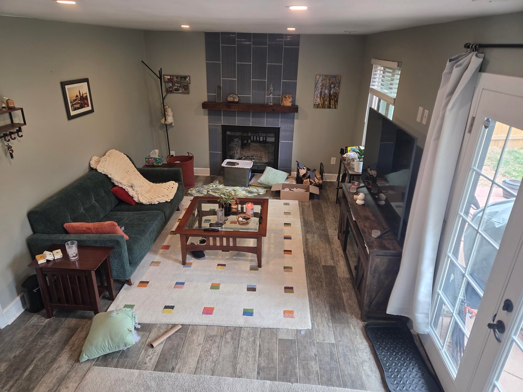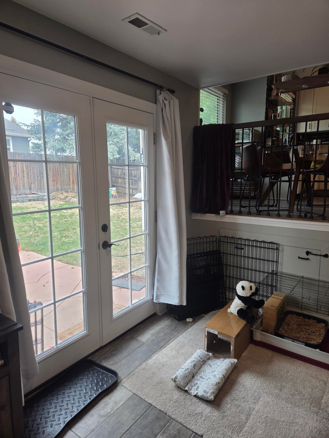 General suggestions on the living room also welcome. It's a sunken living room in a split-level home so limited on light, but want to make it feel more welcoming. Current plans are to paint the walls an off white, eventually replace the hideous fireplace tiling with an undetermined alternative, and add a tall house plant. It's a bunny free roam area, so that limits us with some things.