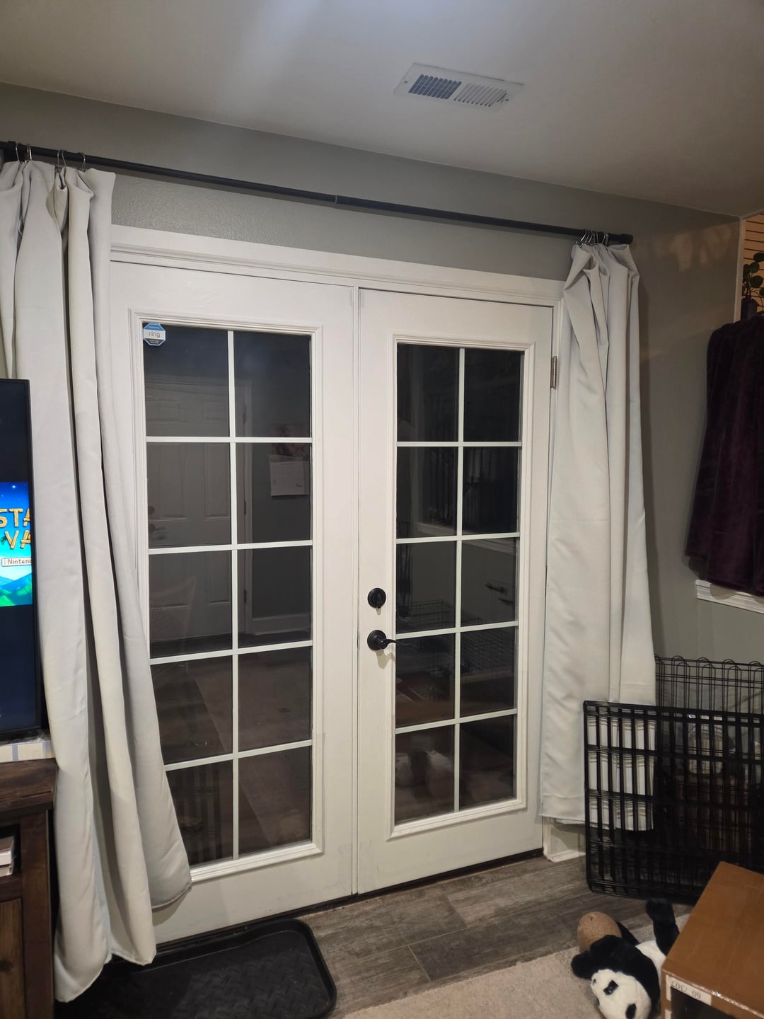 Looking to replace these curtain liners with a more asthetic permanent solution. Wondering if curtains or blinds would be more appropriate. Seems limited on space for curtains given the TV and stand. Thoughts on blind mechanisms that don't require drilling into the doors, and color/material recommendations?