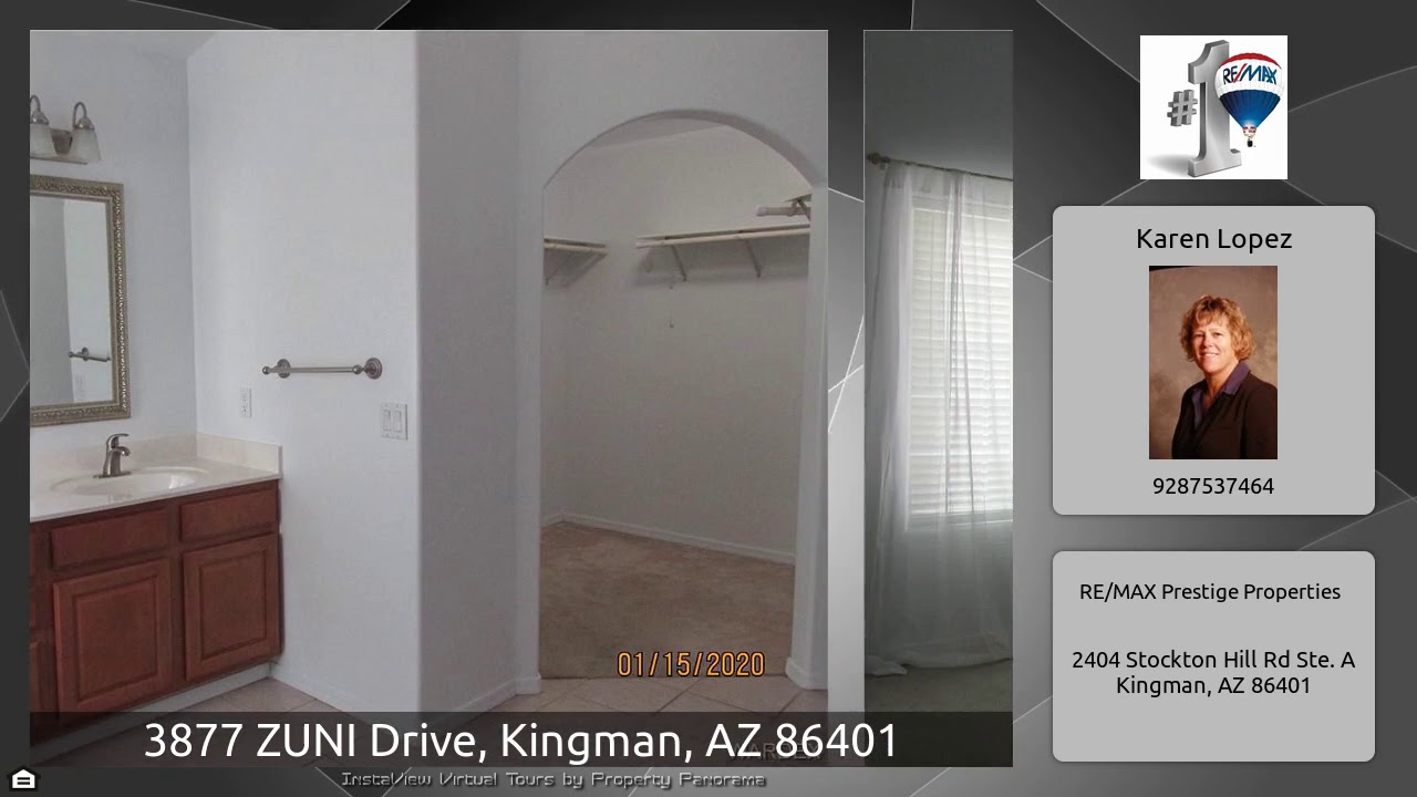 The Virtual Tour for the property at 3877 ZUNI Drive, Kingman, AZ 86401 listed for $365,000: Other homes for sale by Karen Lopez of RE/MAX Prestige Properties: Wonderful Executive style home in the desirable area of Hualapai Foothill Estates. You enter into a beautiful entry way that leads to the formal living room, formal dining area and den/study/4th bedroom. Once inside you will see how grand the open living spaces area. Lovely built ins, gas fireplace, wonderfully appointed kitchen with double wall ovens, electric cooktop, casual dining area, ample counter and cabinets, and french doors that …