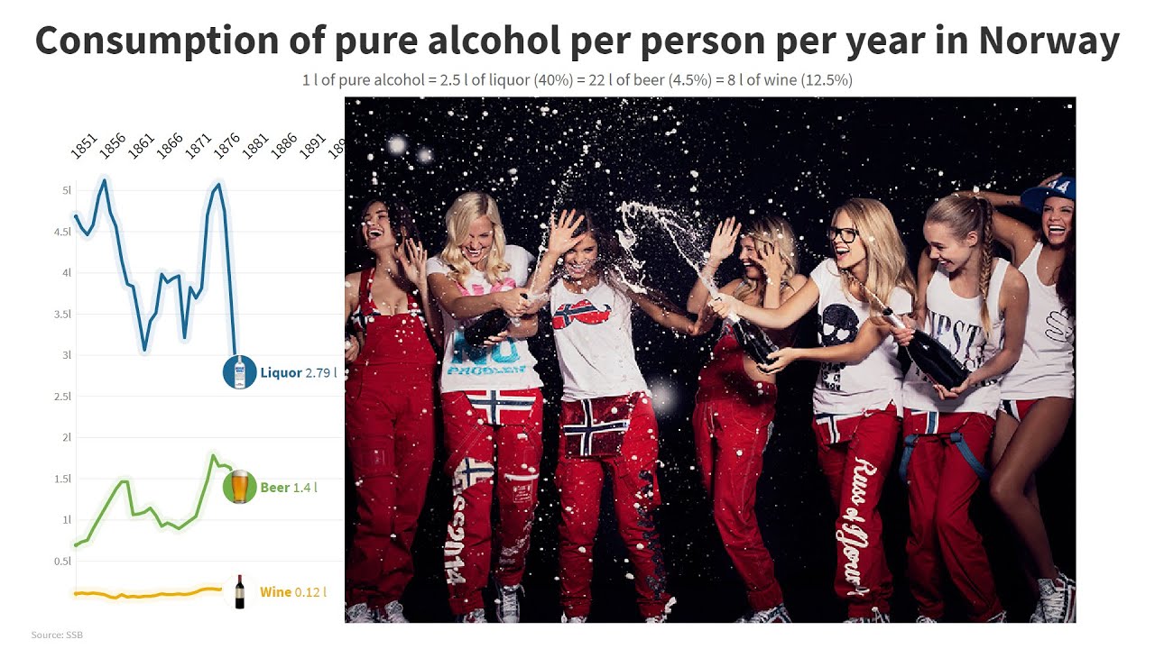 This video show the evolution of alcohol consumption among the population in Norway aged over 15 from 1850 until 2020.