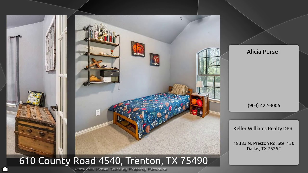 The Virtual Tour for the property at 610 County Road 4540, Trenton, TX 75490 listed for $365,000: Other homes for sale by Alicia Purser of Keller Williams Realty DPR: This beautiful property is reminiscent of a mountain retreat surrounded by trees! Gorgeous home with pool, fire pit & covered patio for your outside enjoyment. The living room features a soaring ceiling, built-in entertainment center, tile flooring, stone wood-burning fireplace and a wall of windows overlooking the woods. Versatile formal living or dining room and adjacent study with French doors offer flexible living spaces. …