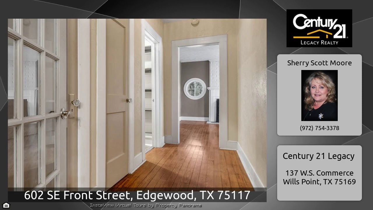 The Virtual Tour for the property at 602 SE Front Street, Edgewood, TX 75117 listed for $179,900: Other homes for sale by Sherry Scott Moore of Century 21 Legacy: Gingerbread trim & porches all around!Yesteryear charm abounds in this spacious 3 bdr, 2 bath vintage frame home on almost an acre!Modern coveniences in a historic setting! Moved to its present location in the early 1990's, is beautifully restored & move in ready! Hardwood flooring, central heat & air.Formal living room has WBFP with unique circular accent window! Formal dining with french door,kitchen with eating bar and …