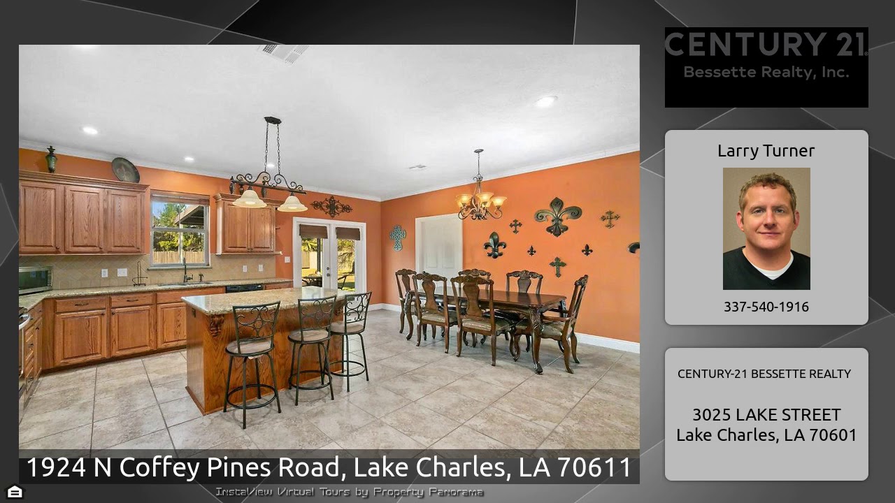 The Virtual Tour for the property at 1924 N Coffey Pines Road, Lake Charles, LA 70611 listed for $254,500: Other homes for sale by Larry Turner of CENTURY-21 BESSETTE REALTY: One owner home in Moss Bluff. Three bedrooms and two full baths with a split floor plan. Living room has corner fireplace. Kitchen and dining are open and spacious. Kitchen features handsome wood cabinetry and center island with eat in breakfast bar. There are granite counter tops and stainless steel appliances. French doors off dining area lead to large covered patio overlooking inground pool and hot tub. The backyard is …