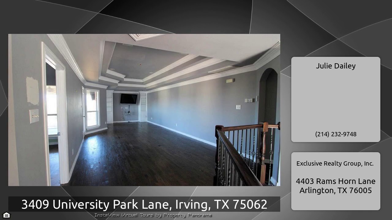 The Virtual Tour for the property at 3409 University Park Lane, Irving, TX 75062 listed for $399,900: Other homes for sale by Julie Dailey of Exclusive Realty Group, Inc.: Fabulous brick two story home located in a gated community. The open and spacious kitchen is perfect for entertaining with formal dining just off the butler's pantry. A study is located just off the front entry with french doors for privacy. The cozy fireplace is perfect for chilly winter's nights. A second generous sized living area is located upstairs. The master suite is the perfect get away from the day. The bath with …