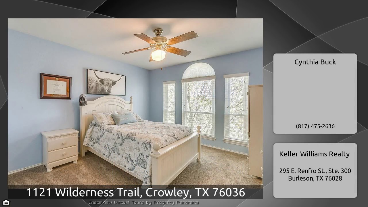 The Virtual Tour for the property at 1121 Wilderness Trail, Crowley, TX 76036 listed for $329,999: Other homes for sale by Cynthia Buck of Keller Williams Realty: Gorgeous 5 Bedroom, 3 Bath, 3 Car Garage on Corner Lot in Deer Creek Estates! Features: Beautiful Eng. Wood Flooring, Plantation Shutters, Study with French Doors, Formal Dining, Main Living with Gas Fireplace, Breakfast Room, Island Kitchen with Butler's Pantry, Master Suite with Sitting Area, 4 Large Guest Rooms, Game Room, Separate Utility Room! Amazing Floor Plan, Great for Entertaining! Kitchen Features: Granite Counters, Gas …