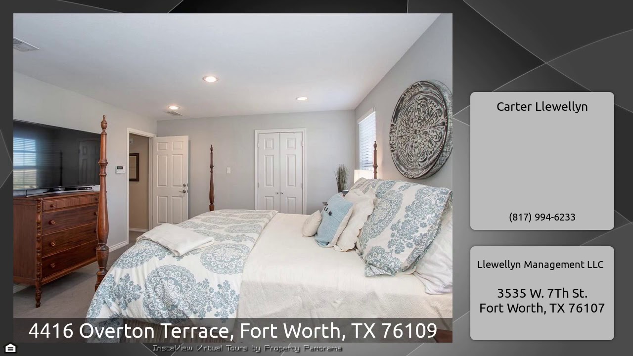 The Virtual Tour for the property at 4416 Overton Terrace, Fort Worth, TX 76109 listed for $620,000: Other homes for sale by Carter Llewellyn of Llewellyn Management LLC: Charming traditional two story home located toward the end of a quiet, tree-lined cul-de-sac. This home is a must see! Two living spaces, a wood burning fireplace, and a large formal dining room is just the beginning. The kitchen has a gas burning stove, an island, and room for a breakfast table. French doors in the kitchen lead to covered patio and fenced backyard. The large master bath boasts an oversized shower, soaking …