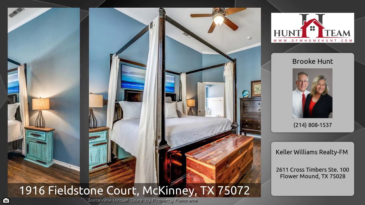 The Virtual Tour for the property at 1916 Fieldstone Court, McKinney, TX 75072 listed for $459,900: Other homes for sale by Brooke Hunt of Keller Williams Realty-FM: Get it while it lasts! Stunning home with no corners cut on detail and design. Most rooms down, only game room or 2nd Master with full bath upstairs, on separate AC zone and leaded glass door to close off if not needed. French doors open to Study across entry from formal dining. Hand scraped hardwoods and slate flooring through out most of downstairs. Granite counters in kitchen with updated black stainless appliances, gas …