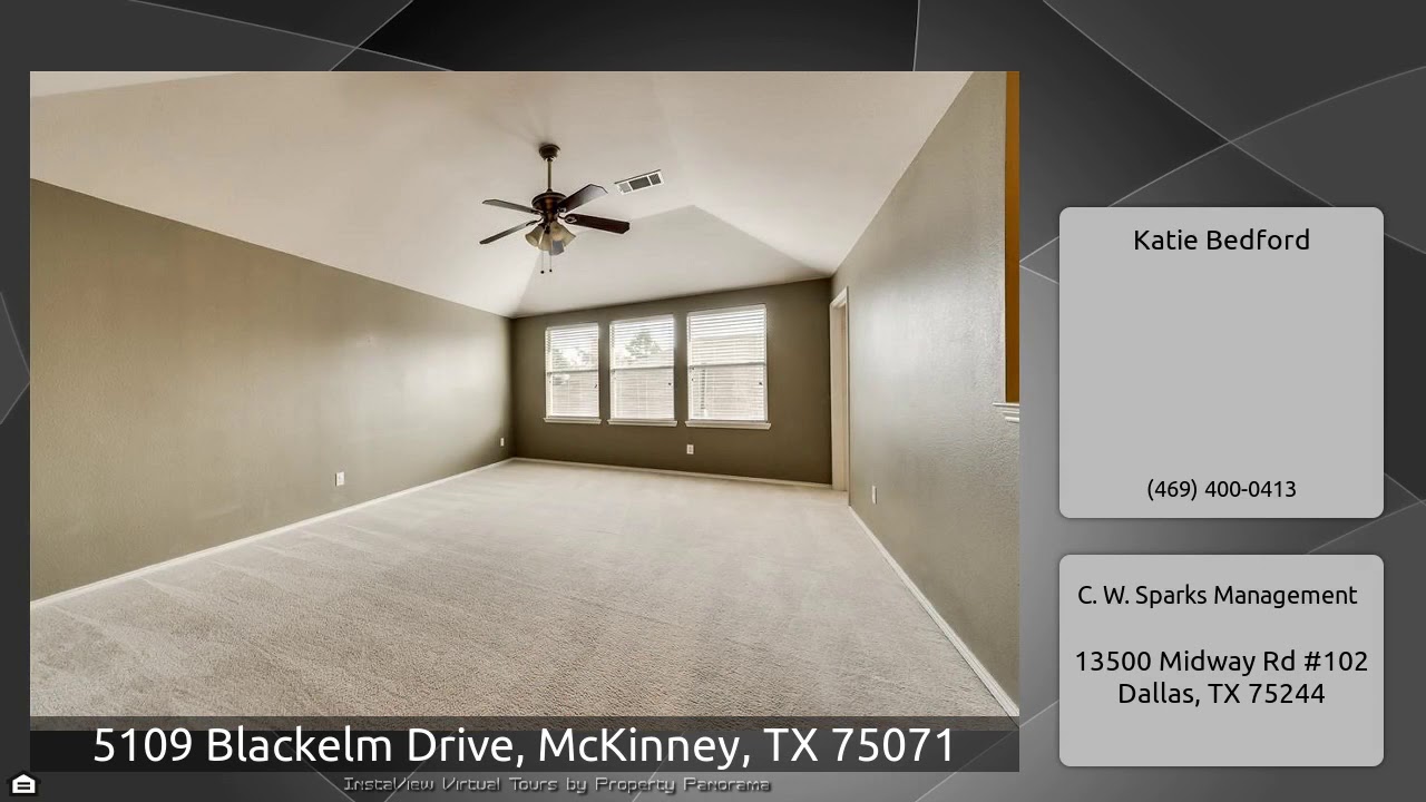 The Virtual Tour for the property at 5109 Blackelm Drive, McKinney, TX 75071 listed for $1,850: Other homes for sale by Katie Bedford of C. W. Sparks Management: Stunning 4 bedroom home located within Prosper ISD. Gorgeous wood floors and beautiful dining area welcome you into the home. Spacious and open living concept with niced living area off of the kitchen. Study with french doors on first floor. Kitchen boasts ample cabinet space, large pantry, island and black appliances. Huge secondary living room on 2nd floor. Large fenced backyard with covered porch. Community pool and playground. …