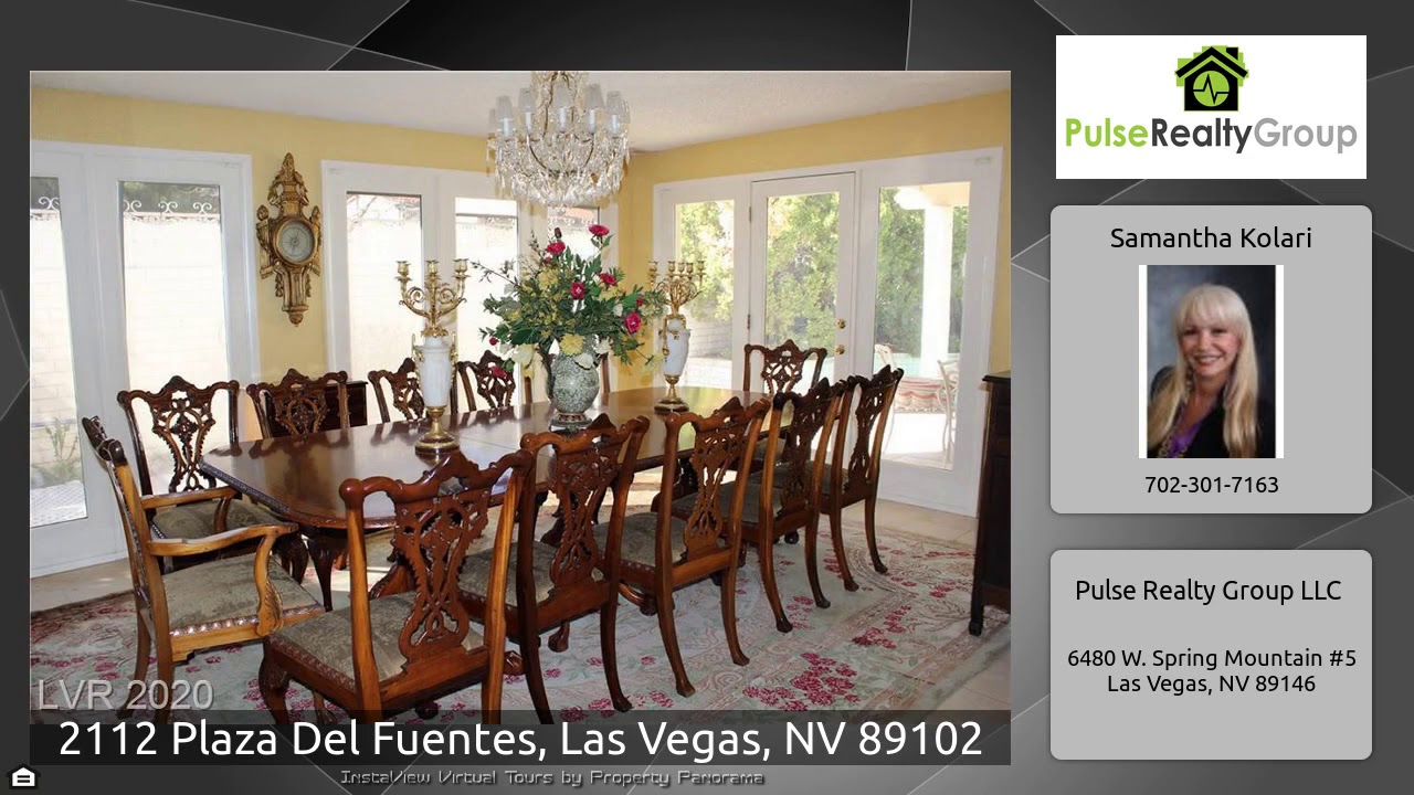 The Virtual Tour for the property at 2112 Plaza Del Fuentes, Las Vegas, NV 89102 listed for $575,000: Other homes for sale by Samantha Kolari of Pulse Realty Group LLC: Guard Gated Spanish Oaks home, Secured courtyard provides privacy, Entry Foyer leads to living room/family rooms and Large formal dining room, High vaulted ceilings throughout, French doors open to backyard/pool and patios, Large Master suite bedroom with dressing room/Walkin closet and entry to balcony. Close to the strip and shopping, Motivated seller, Priced to sell fast. This is a must see home with lots of great history in it.