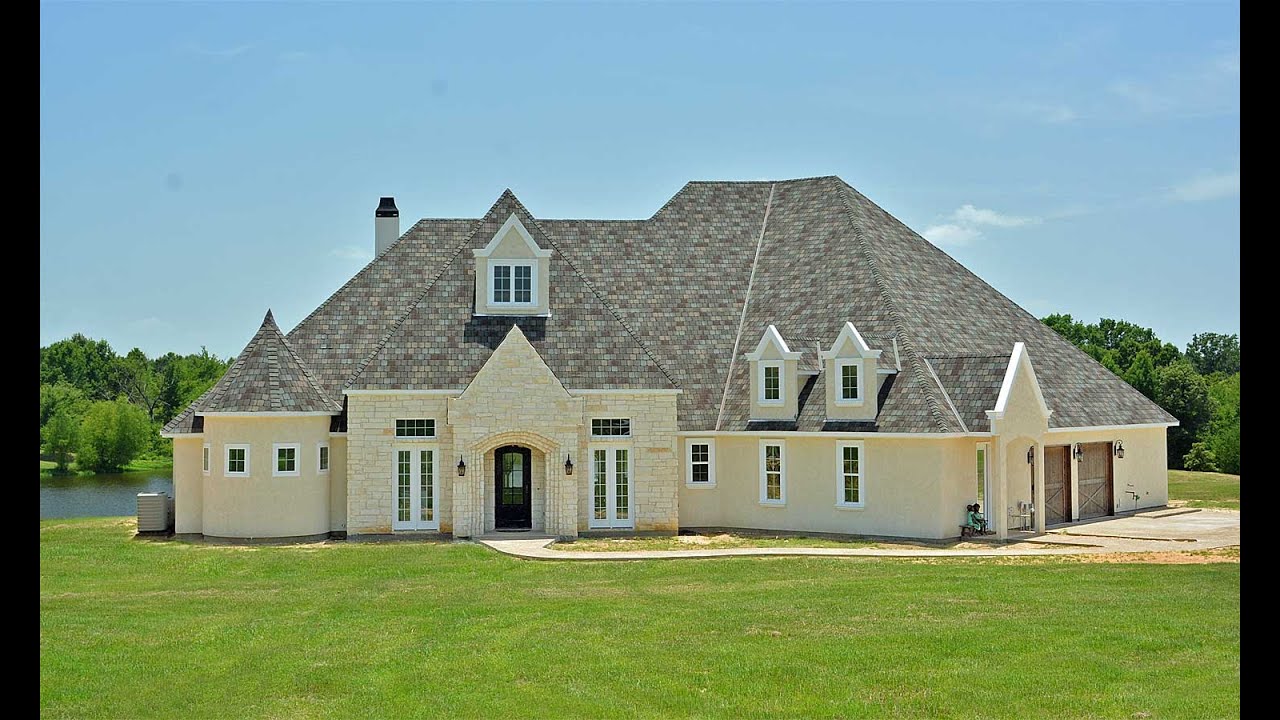 French Chateau inspired custom home on private lake that has lots of upgraded features including; stone exterior, steel front door, double sliding patio door, hardwood floors, laser etched porcelain tiles, designer lighting, custom paint, arched openings, granite counter tops, marble counter tops, custom cabinets, soft close cabinets, apron kitchen sink, central vacuum, pop up mixer, pop up television, and much more. Constructed by www.mikeblakehomes.com.