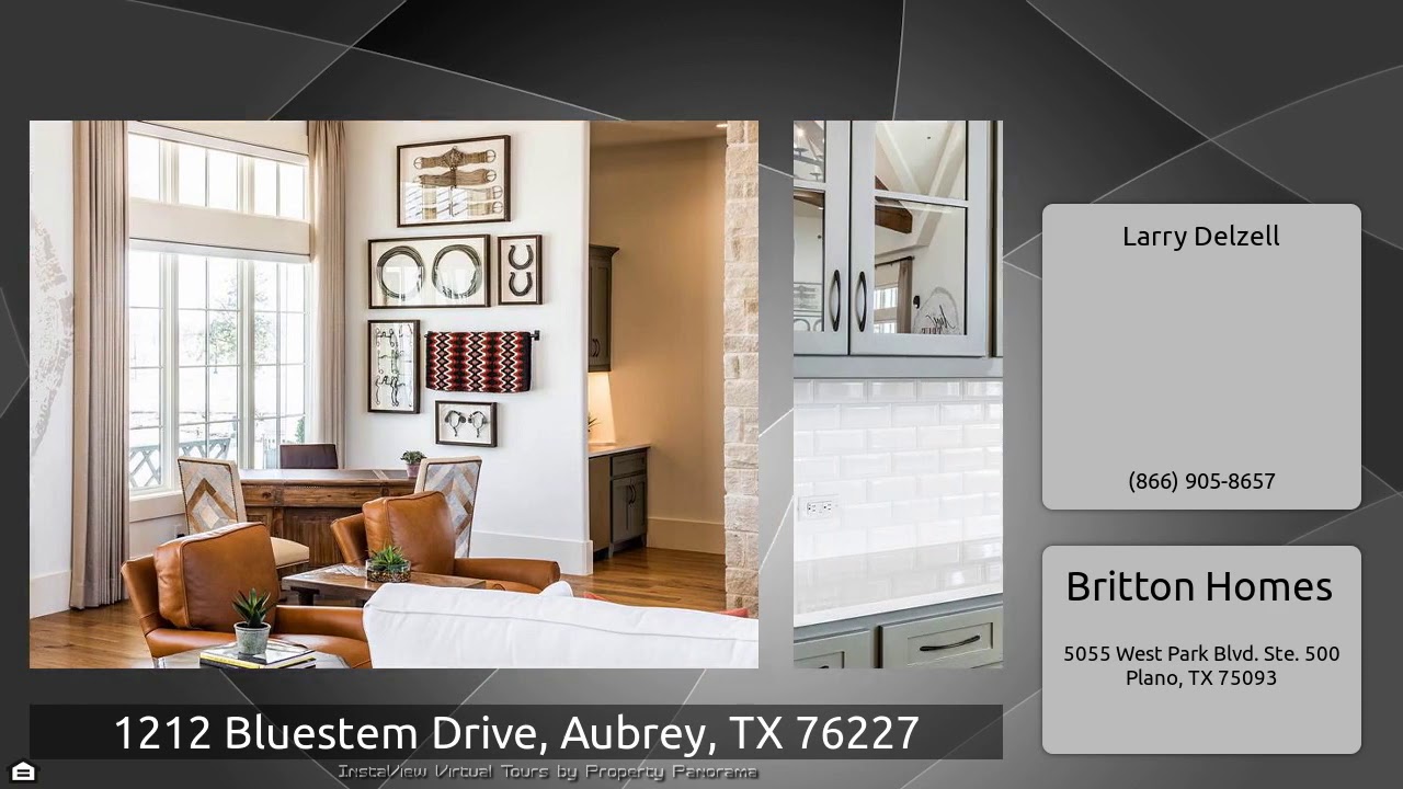 The Virtual Tour for the property at 1212 Bluestem Drive, Aubrey, TX 76227 listed for $474,900: Other homes for sale by Larry Delzell of Britton Homes: PERRY HOMES NEW CONSTRUCTION! Library with French doors and wood-look ceramic tile floor set at the entry. Media room with French doors. Formal dining room with wood-look ceramic tile floor. Kitchen features a large island with built-in seating space. Family room with wood-look ceramic tile floor has a wall of windows and wood mantel fireplace. Private master bedroom features 13-foot ceilings and three large windows. Double doors lead to …
