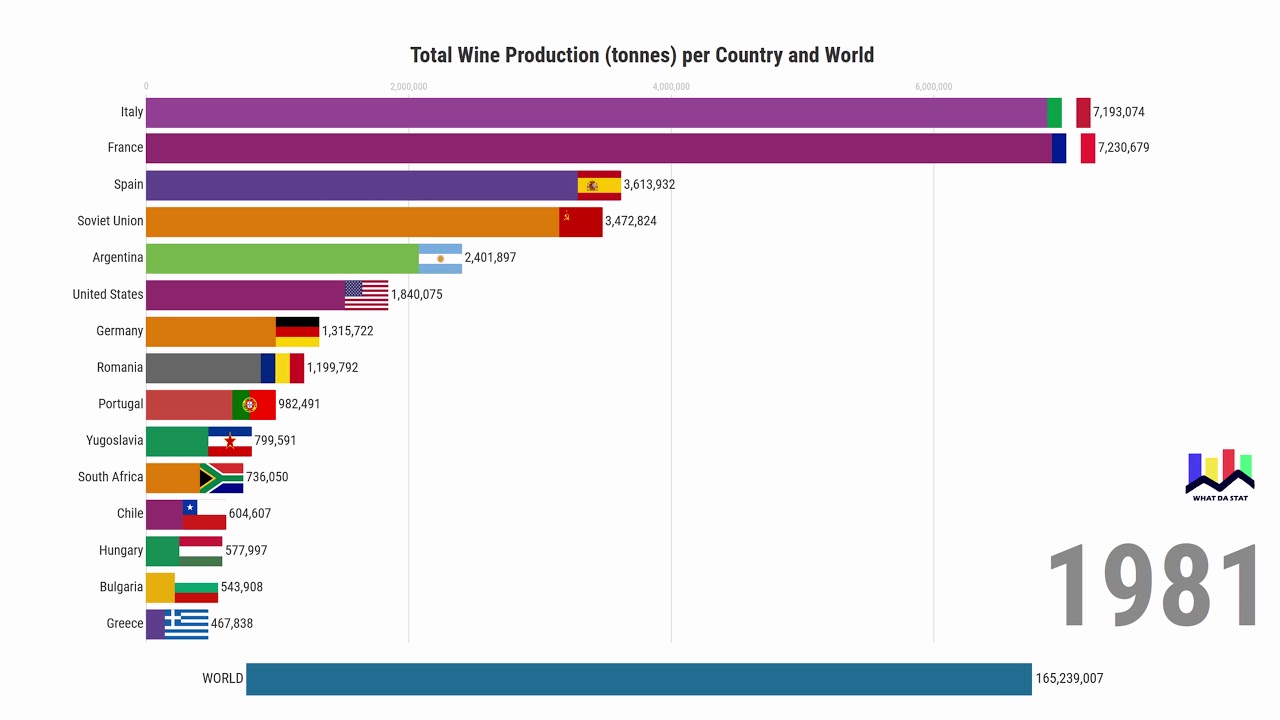 This bar chart race shows the total yearly wine production (tonnes) per country and world, 1961 and forward.