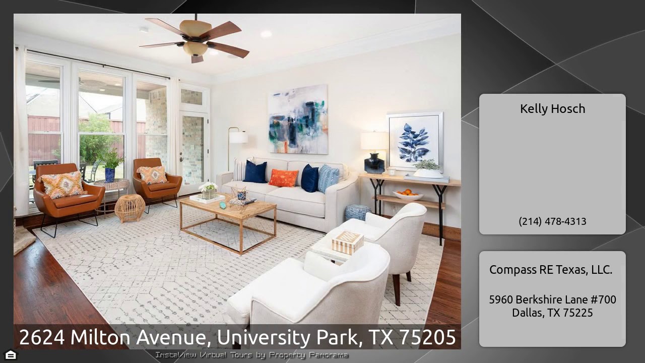 The Virtual Tour for the property at 2624 Milton Avenue, University Park, TX 75205 listed for $1,325,000: Other homes for sale by Kelly Hosch of Compass RE Texas, LLC.: Spacious traditional five-bedroom home in University Park! Step inside the entry that leads to an office with French doors, formal living room and dining room. The kitchen has stainless appliances that opens to the family room overlooking the backyard and patio, complete with fireplace and outdoor TV. One bedroom and bath are downstairs. Master is upstairs along with three additional bedrooms, each with ensuite baths. Other …