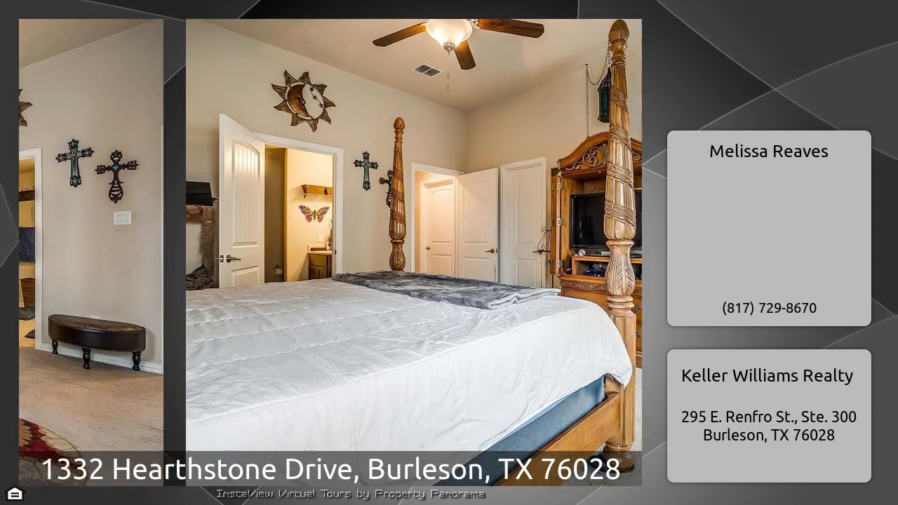 The Virtual Tour for the property at 1332 Hearthstone Drive, Burleson, TX 76028 listed for $236,000: Other homes for sale by Melissa Reaves of Keller Williams Realty: Beautiful brick home, 4 bedrooms plus an office with split bedrooms & open layout. Upon entering notice tile flooring, crown molding & french doors leading into office. Formal dining room is spacious & rounded corners & arched door ways lead to the breakfast area. Kitchen features abundance of storage cabinets, granite counters with tile backsplash, stainless steel appliances include double oven, built in microwave, dishwasher …