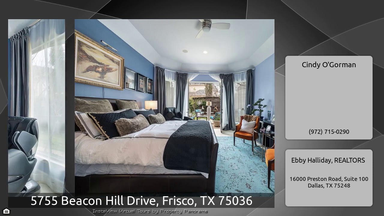 The Virtual Tour for the property at 5755 Beacon Hill Drive, Frisco, TX 75036 listed for $799,000: Other homes for sale by Cindy O'Gorman of Ebby Halliday, REALTORS: This beautiful Shaddock built home features large open spaces and was designed for style and functionality throughout! Dramatic 2 story entry with impressive spiral staircase opens to formals. Wood beamed soaring ceiling and dramatic FP in family room. State of the art kitchen with stainless appliances, gas range, granite, large island, and wonderful casual dining area. Luxurious master with French doors opening to patio plus …