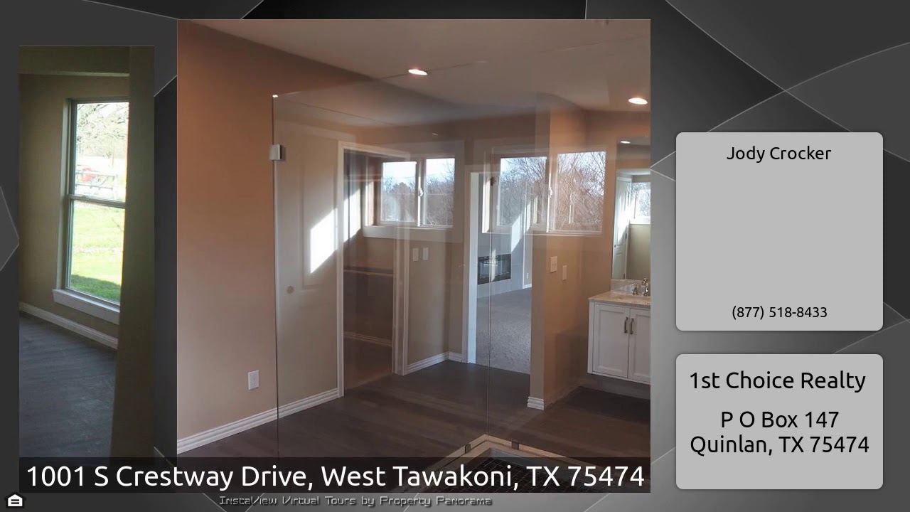 The Virtual Tour for the property at 1001 S Crestway Drive, West Tawakoni, TX 75474 listed for $289,000: Other homes for sale by Jody Crocker of 1st Choice Realty: This home is beautiful and spacious with a unique floor plan! There is so much to gloat about on this home. It's completely remodeled with nothing spared. From the huge windowed family room to the absolute tranquil master suite with colored rain shower, relaxing soaking tub, inset fireplace and french doors leading to the balcony. The large kitchen offers an open concept to dining area and breakfast bar. Main living area leads to …