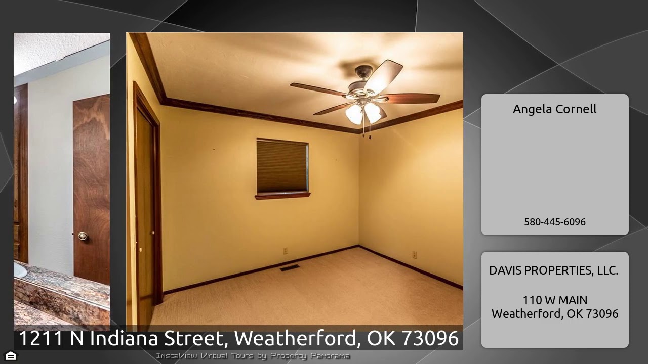 The Virtual Tour for the property at 1211 N Indiana Street, Weatherford, OK 73096 listed for $241,500: Other homes for sale by Angela Cornell of DAVIS PROPERTIES, LLC.: This lovely Grandview home is move in ready. The home has 3 spacious bedroom with lots of closet space and extra storage in the hallway. Ceiling fans in every room. The spacious kitchen features stainless steel appliances, granite countertops, tumbled Marble backsplash and can lighting and is open to the dining area. The living room features a fireplace and bookshelves and French doors leading to the beautiful sunroom. The …
