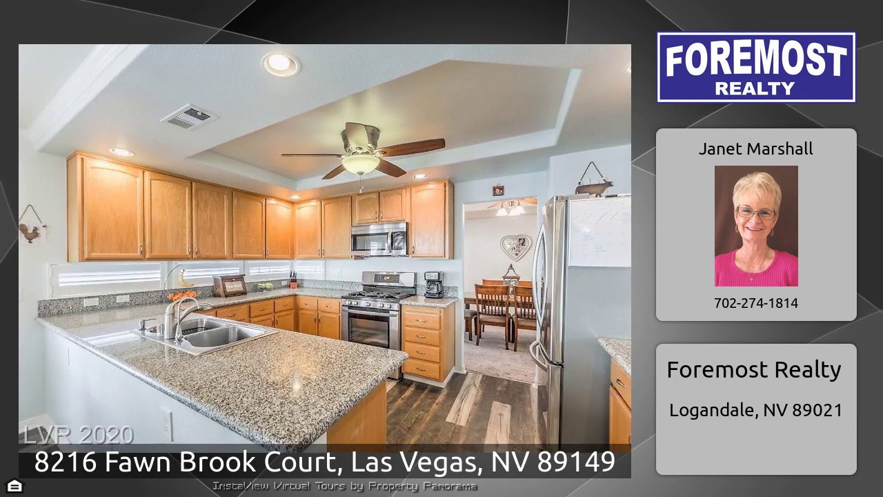 The Virtual Tour for the property at 8216 Fawn Brook Court, Las Vegas, NV 89149 listed for $474,900: Other homes for sale by Janet Marshall of Foremost Realty: 2-Story Home in desirable Timberlake community! French doors to remodeled backyard, synthetic grass, lap pool & spa w/safety fence. Oversized patio cover, dog run, RV gate, concrete on side to park your toys! Plantation shutters for natural light! Open kitchen w/granite counters, SS appliances. Formal dining & Liv rm – great for entertaining. New wood laminate & carpet. Upstairs has loft, office & 4 bds. Spacious Mstr bd/bath. COME & SEE!