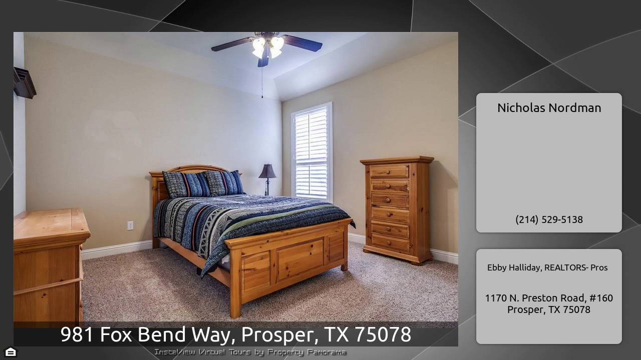 The Virtual Tour for the property at 981 Fox Bend Way, Prosper, TX 75078 listed for $649,978: Other homes for sale by Nicholas Nordman of Ebby Halliday, REALTORS- Pros: Stunning single story with a gorgeous pool in Deer Run in Prosper! Hard to find!! Covered front porch leads to the entry with wood floors that extend to the dining, family room and kitchen. Spacious dining room is perfect for entertaining. Study with french doors. Chef's kitchen with huge island, KitchenAid gas cooktop, stainless steel appliances and breakfast nook opens to the spacious family room complete with gas …