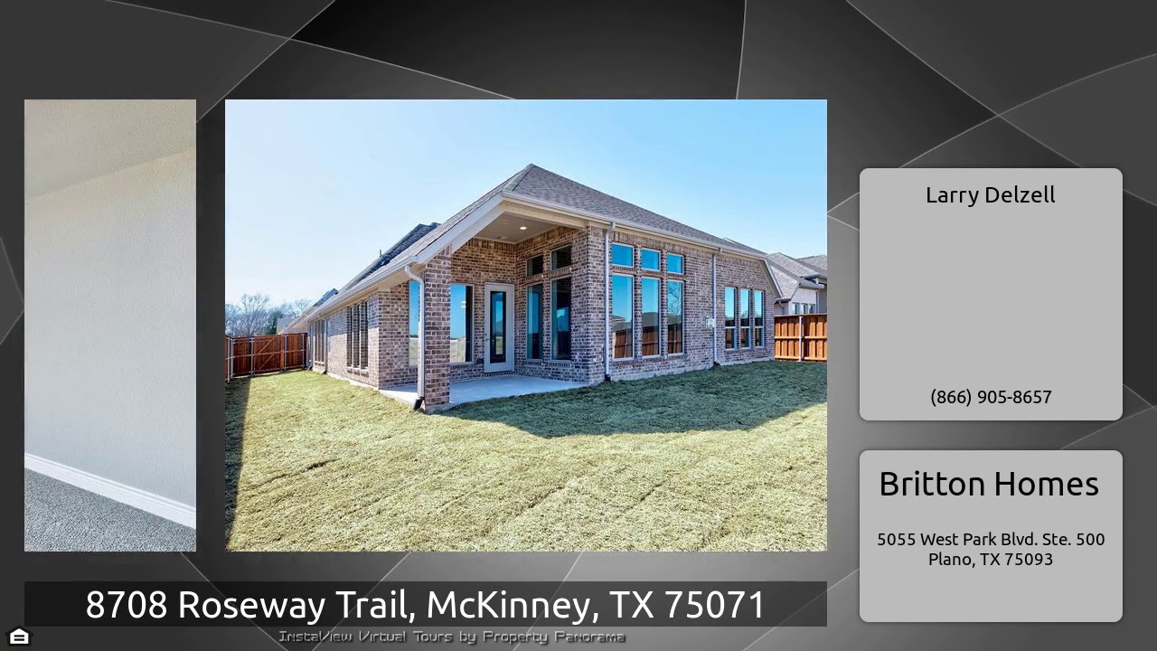 The Virtual Tour for the property at 8708 Roseway Trail, McKinney, TX 75071 listed for $424,900: Other homes for sale by Larry Delzell of Britton Homes: PERRY HOMES NEW CONSTRUCTION READY FOR MOVE-IN! Entry welcomes with a 12-foot ceiling. Kitchen features an island with built-in seating space and 5-burner gas cooktop and stainless steel appliances. Dining area with a wall of windows. Game room with French doors. Open family room with ceramic tile floor, a wall of windows and wood mantel fireplace. Secluded master bedroom with a wall of windows. Double doors lead to master bath with dual …