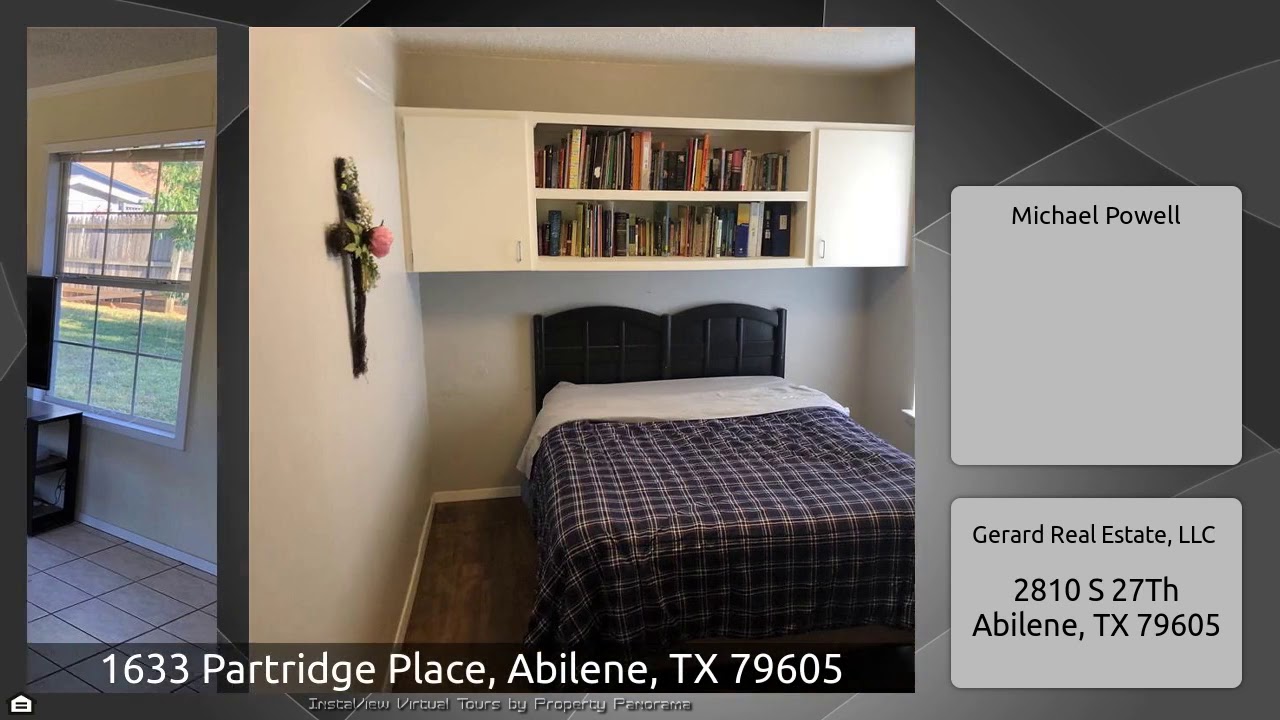 The Virtual Tour for the property at 1633 Partridge Place, Abilene, TX 79605 listed for $1,295: Other homes for sale by Michael Powell of Gerard Real Estate, LLC: Adorable home is welcoming and bright with cozy wood burning fireplace. French doors off the dining room. Close to Dyess AFB, shopping and restaurants.