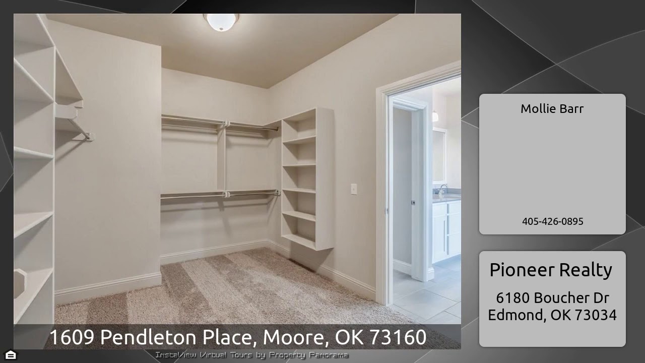 The Virtual Tour for the property at 1609 Pendleton Place, Moore, OK 73160 listed for $284,201: Other homes for sale by Mollie Barr of Pioneer Realty: 3 bed w/ study! Beautiful curb appeal welcomes you with an inviting porch entrance and a spacious 3 car garage. Upon entering the home, french doors lead into the study with a walk-in closet. The open concept living room with high ceilings, corner fireplace flows right into the kitchen and dining area, creating a wonderful gathering area for family and friends. The beautiful kitchen features quality cabinetry to the ceiling, spacious island. The …